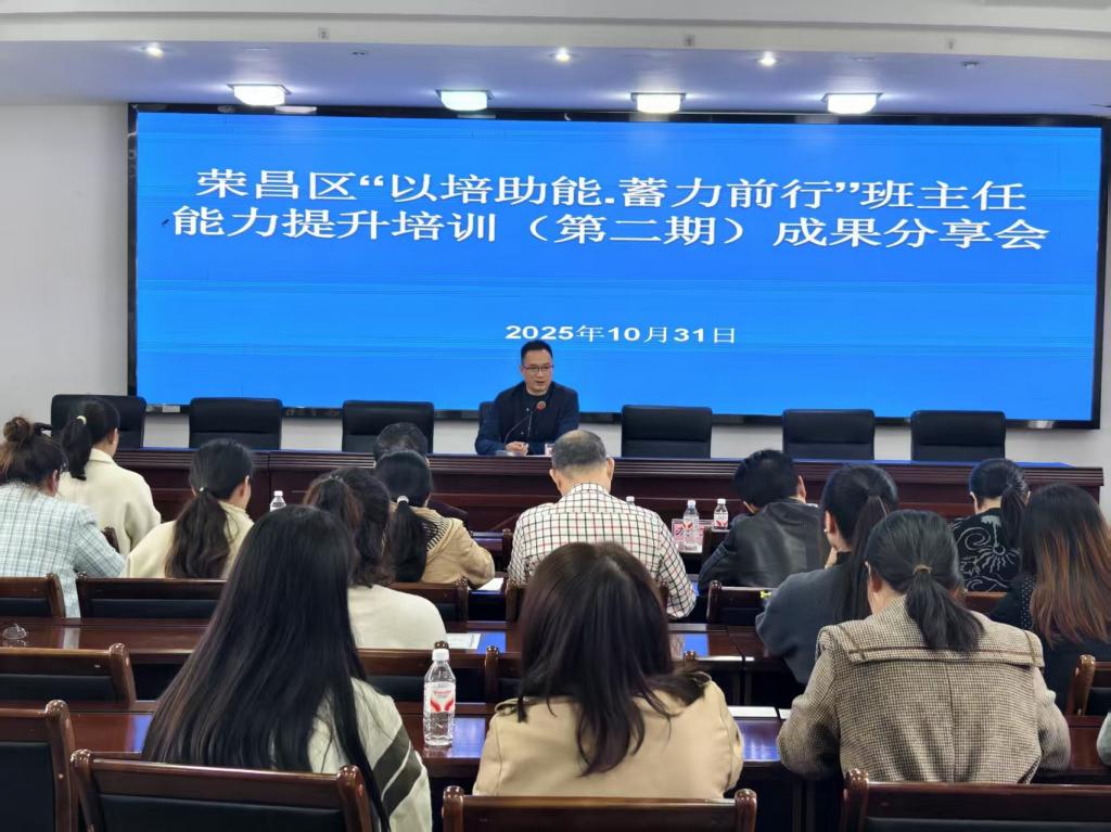 为巩固市外培训成效、搭建育人经验交流平台,10月31日,荣昌区教委以“以培助能·蓄力前行”为主题的班主任能力提升培训(第二期)成果分享会在6楼会议室顺利召开。10月19日至24日,47名优秀中小学班主任赴浙江绍兴完成系统培训后,齐聚一堂共话育人之道、共探成长路径,让培训成果在思想碰撞中落地生根。