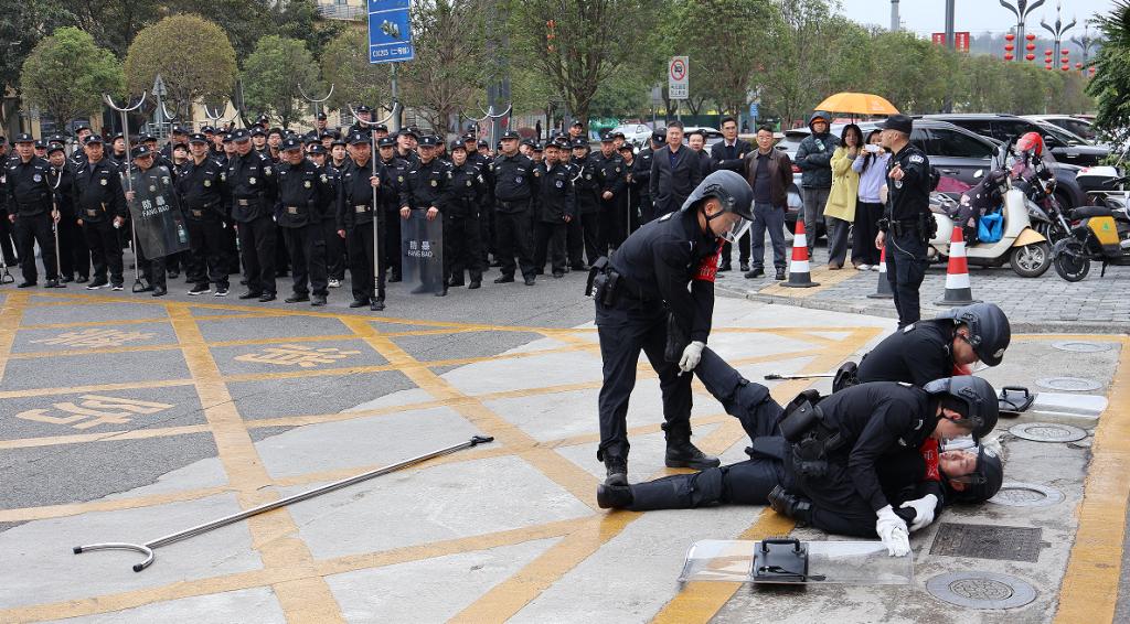 为检验培训成效,提升参训保安应急处置能力与警保协同作战水平,上午11时,一场逼真的校园门口应急模拟演练在职教中心三号门正式开展。演练还原校门强行闯校真实突发场景,“可疑人员”试图冲闯校门,校园保安团队第一时间启动应急预案,规范使用安保器械开展处置。短短两分钟内,增援警力迅速抵达,与校园保安无缝协同、高效配合,快速将“嫌疑人”制服并带离,整个处置过程紧张有序、流程规范、响应迅速,充分展现了荣盾保安队伍的专业素养与应急能力,赢得现场观摩人员的阵阵掌声。