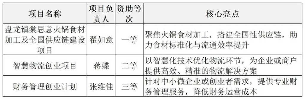 作为重庆助力大学生创业的重点计划,经自主申报、区县初审、市级复审、专家评审等多轮严格筛选,其中翟如意负责的“盘龙镇棠思意火锅食材加工及全国供应链建设项目”获一等资助;蒋蝶的“智慧物流创业项目”获二等资助;张维佳的“财务管理创业计划”获三等资助。三个项目均纳入重庆市创业联盟项目库,优先参加“渝创渝新”创业加速计划暨导师服务团活动,并提供导师帮扶、交流展示、资源对接、项目路演等帮扶。