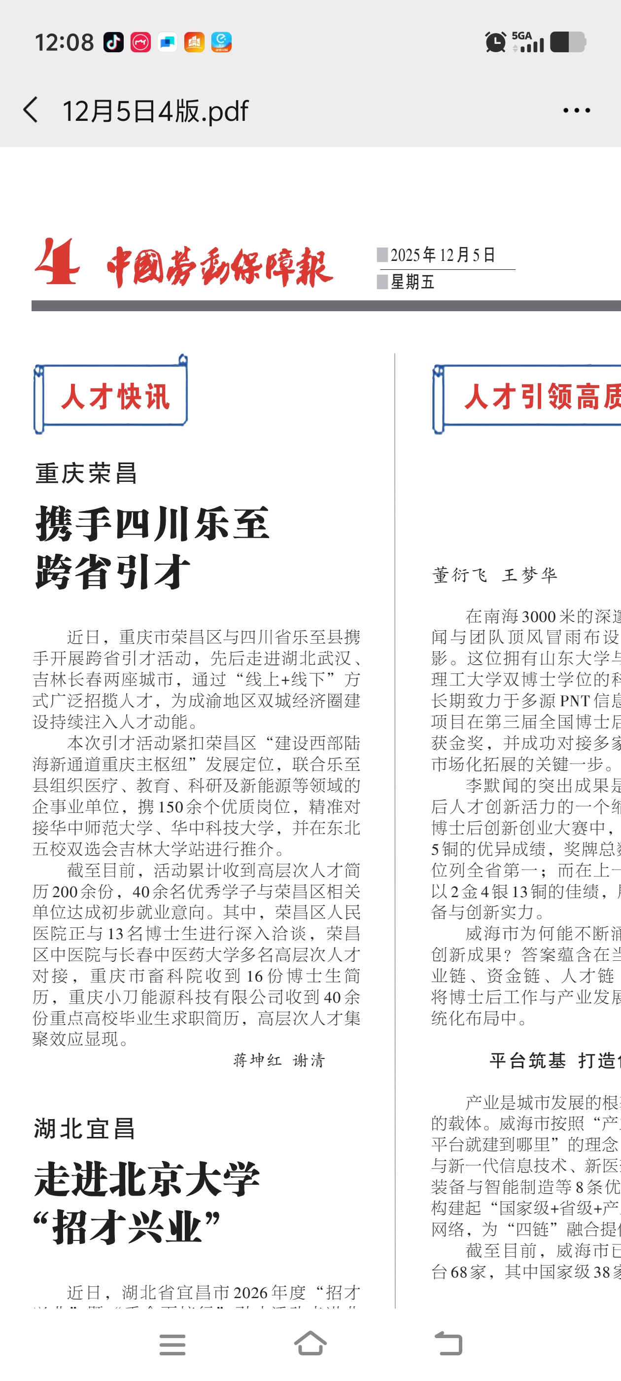 中国劳动保障报:重庆荣昌携手四川乐至跨省引才,原文内容如下: