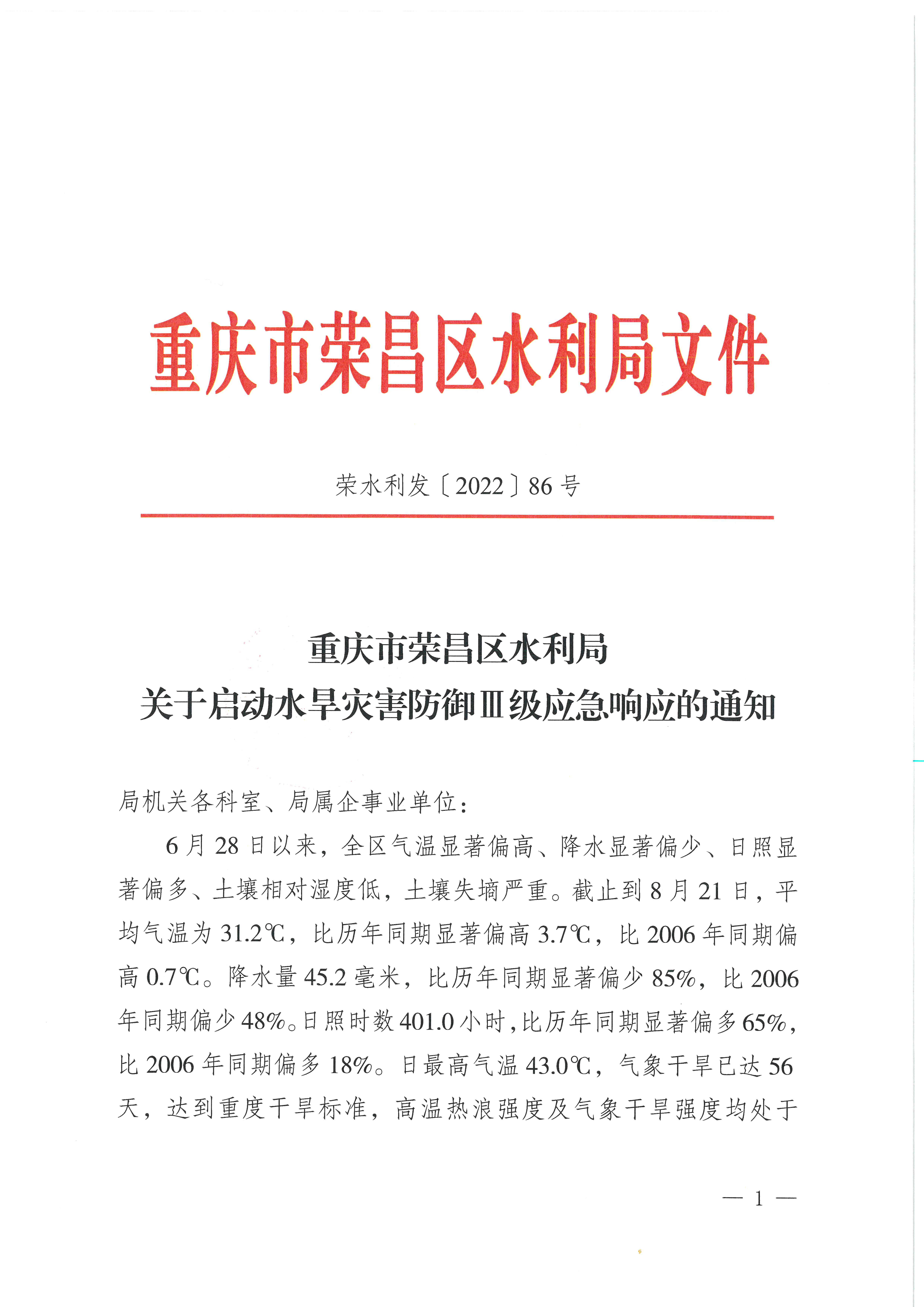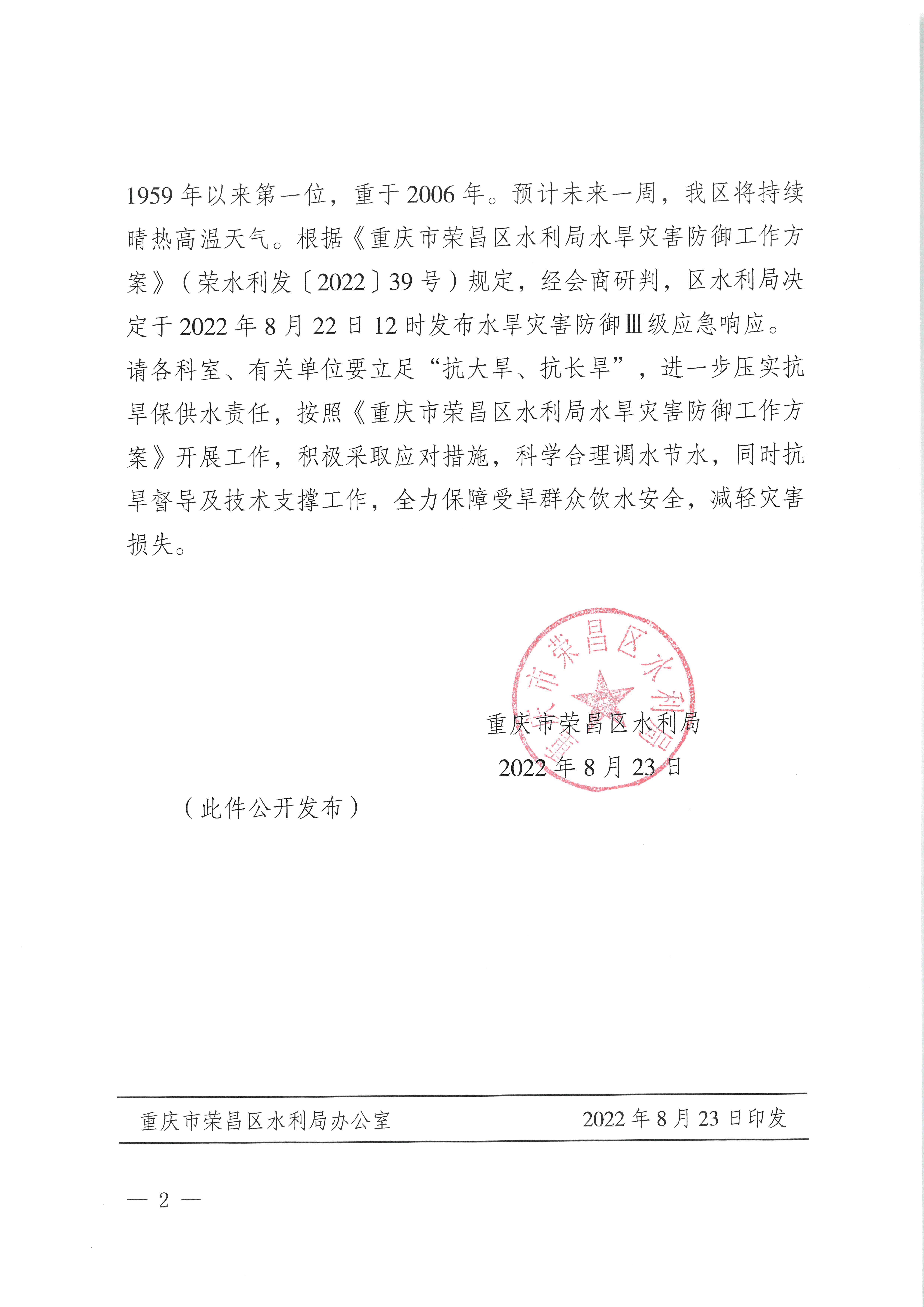 重庆市荣昌区水利局关于启动水旱灾害防御III级应急响应的通知(荣水利发〔2022〕86号)