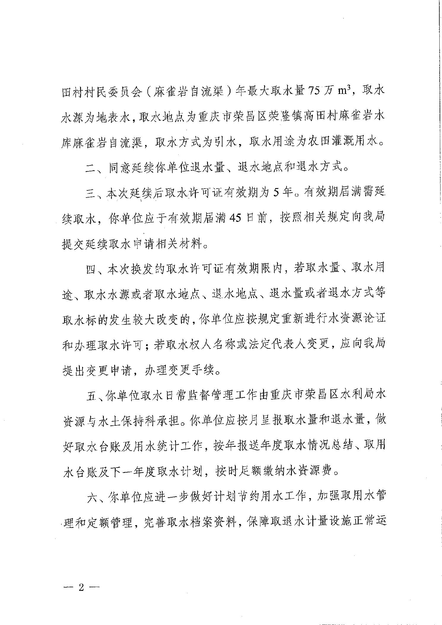 重庆市荣昌区水利局关于同意重庆市荣昌区荣隆镇高田村村民委员会(麻雀岩自流渠)延续取水行政许可的决定(荣水利许可〔2023〕50号)