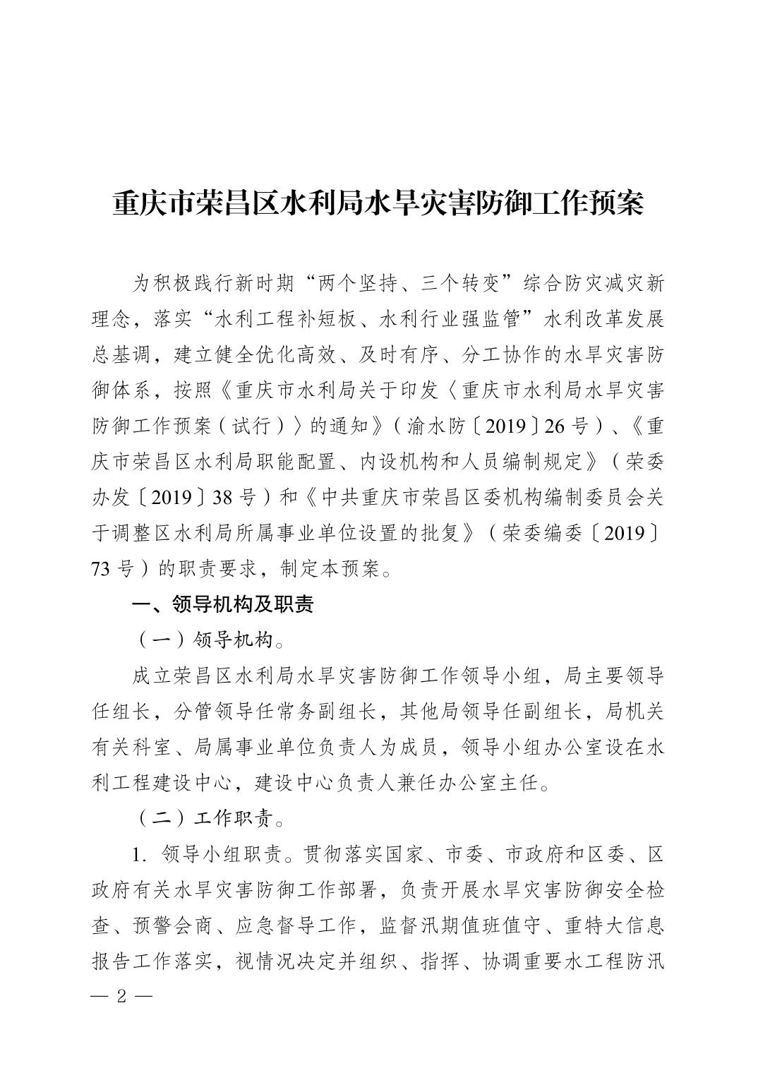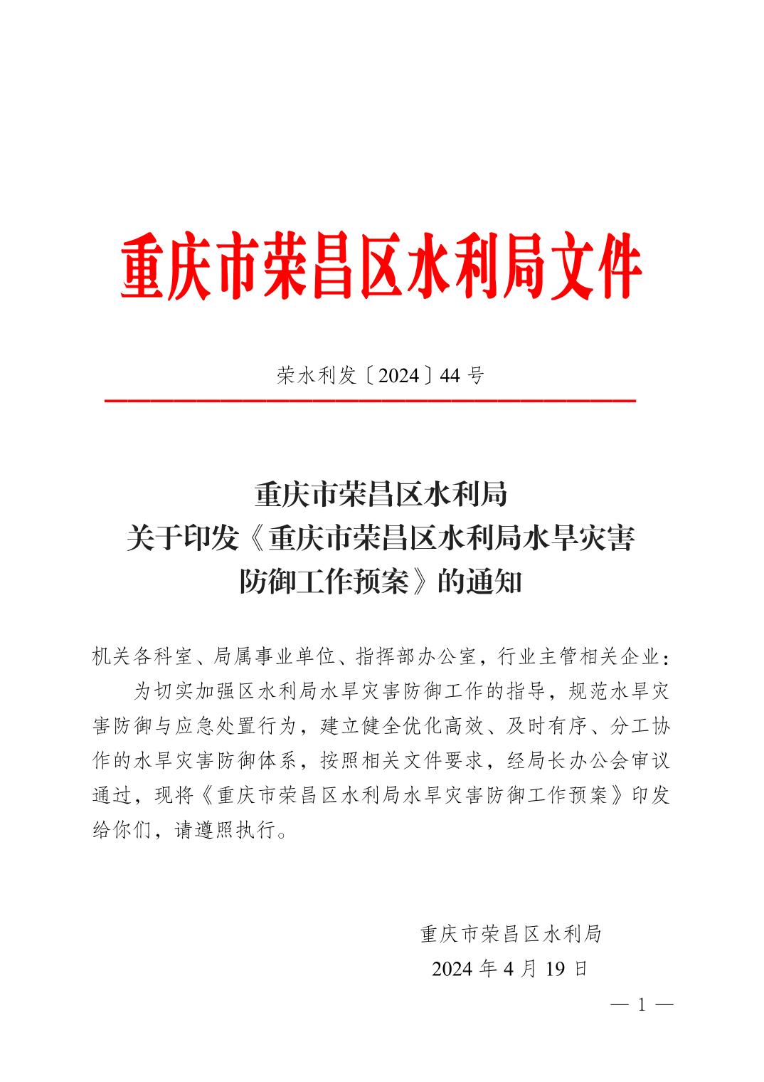荣水利发〔2024〕44号重庆市荣昌区水利局关于印发《重庆市荣昌区水利局水旱灾害防御工作预案》的通知.pdf