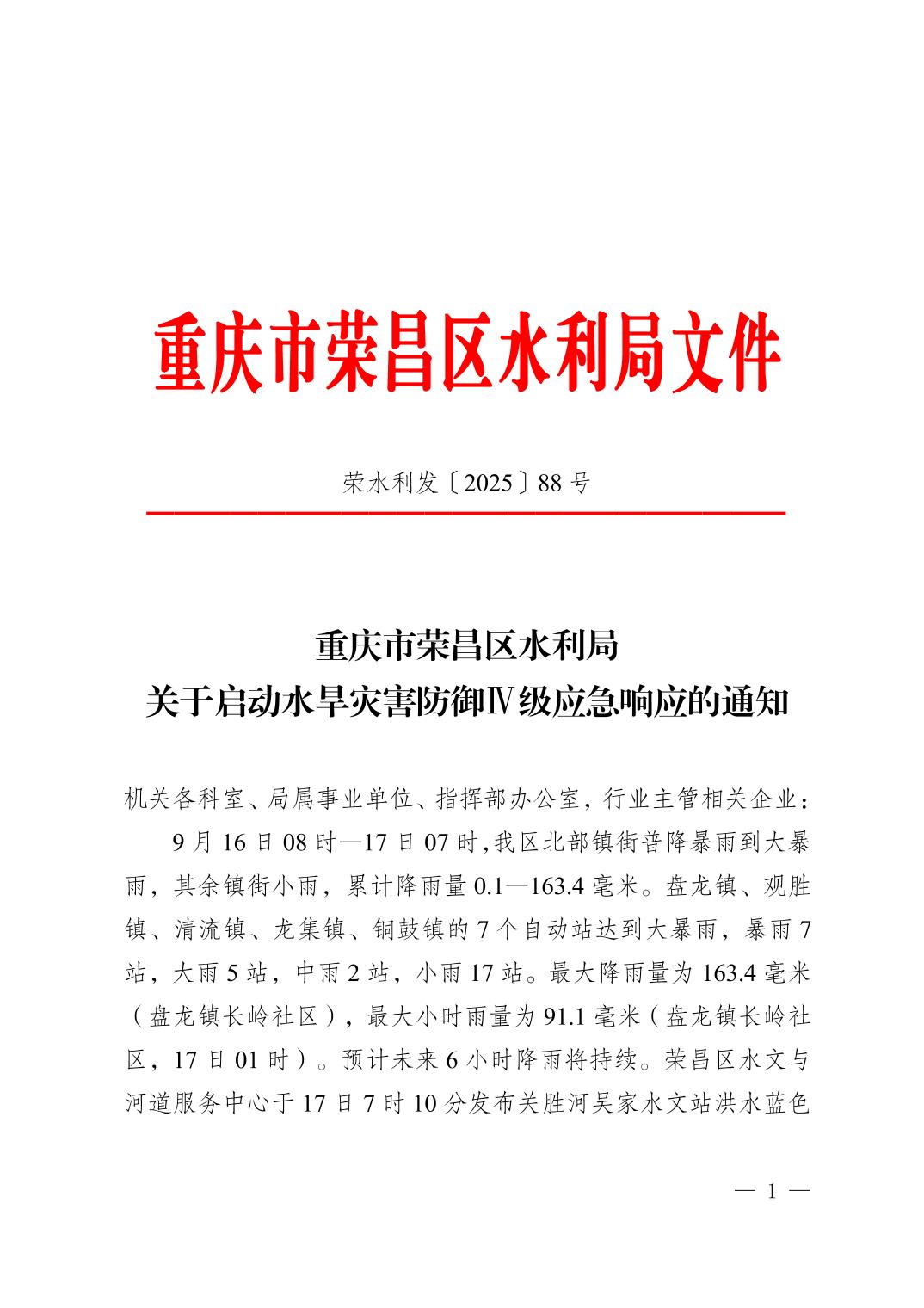 重庆市荣昌区水利局关于启动水旱灾害防御Ⅳ级应急响应的通知(荣水利发〔2025〕88 号)