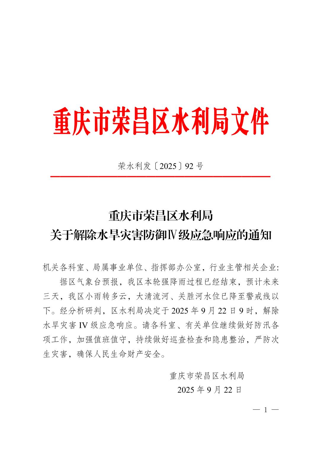 重庆市荣昌区水利局关于解除水旱灾害防御Ⅳ级应急响应的通知(荣水利发〔2025〕92号)