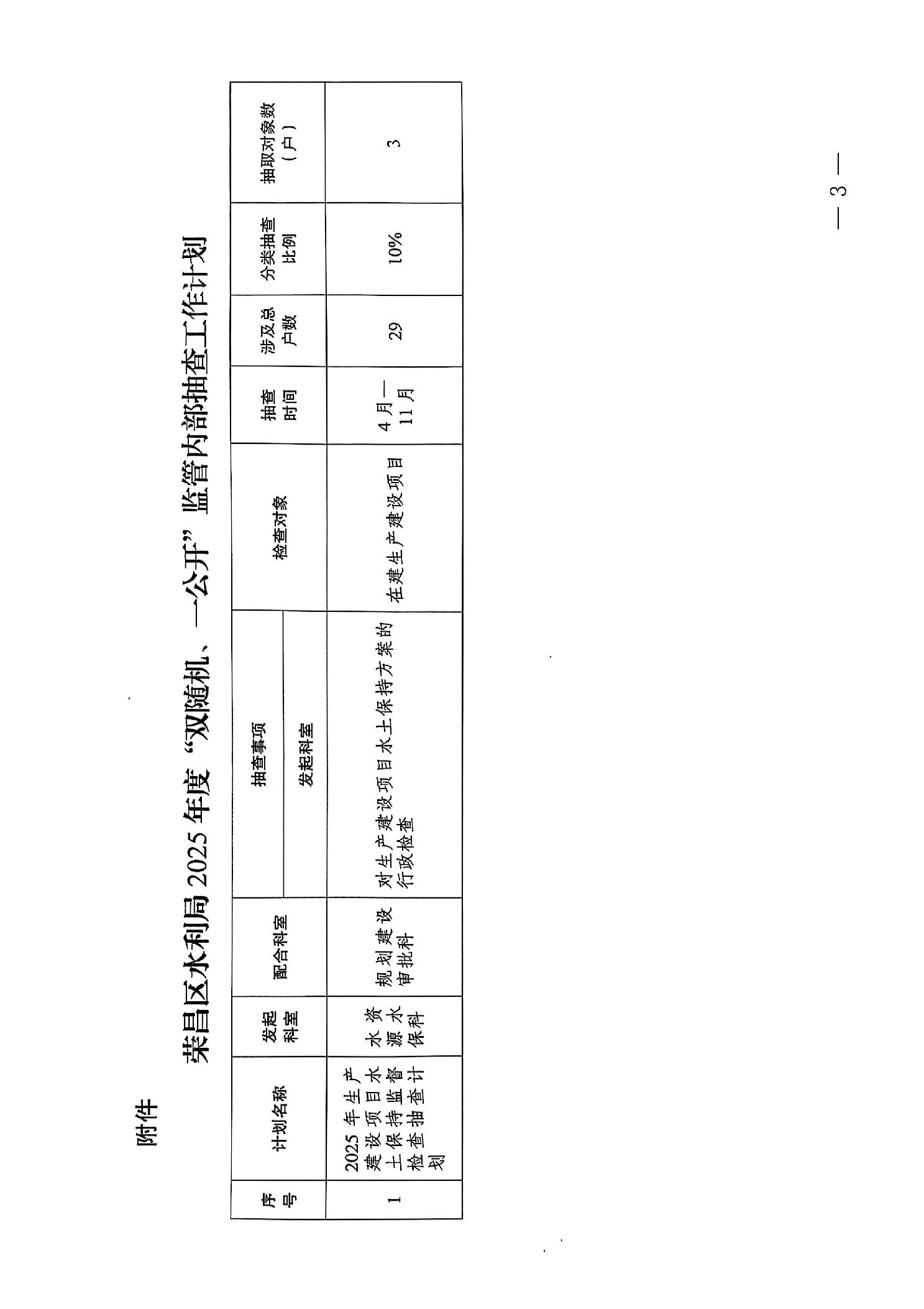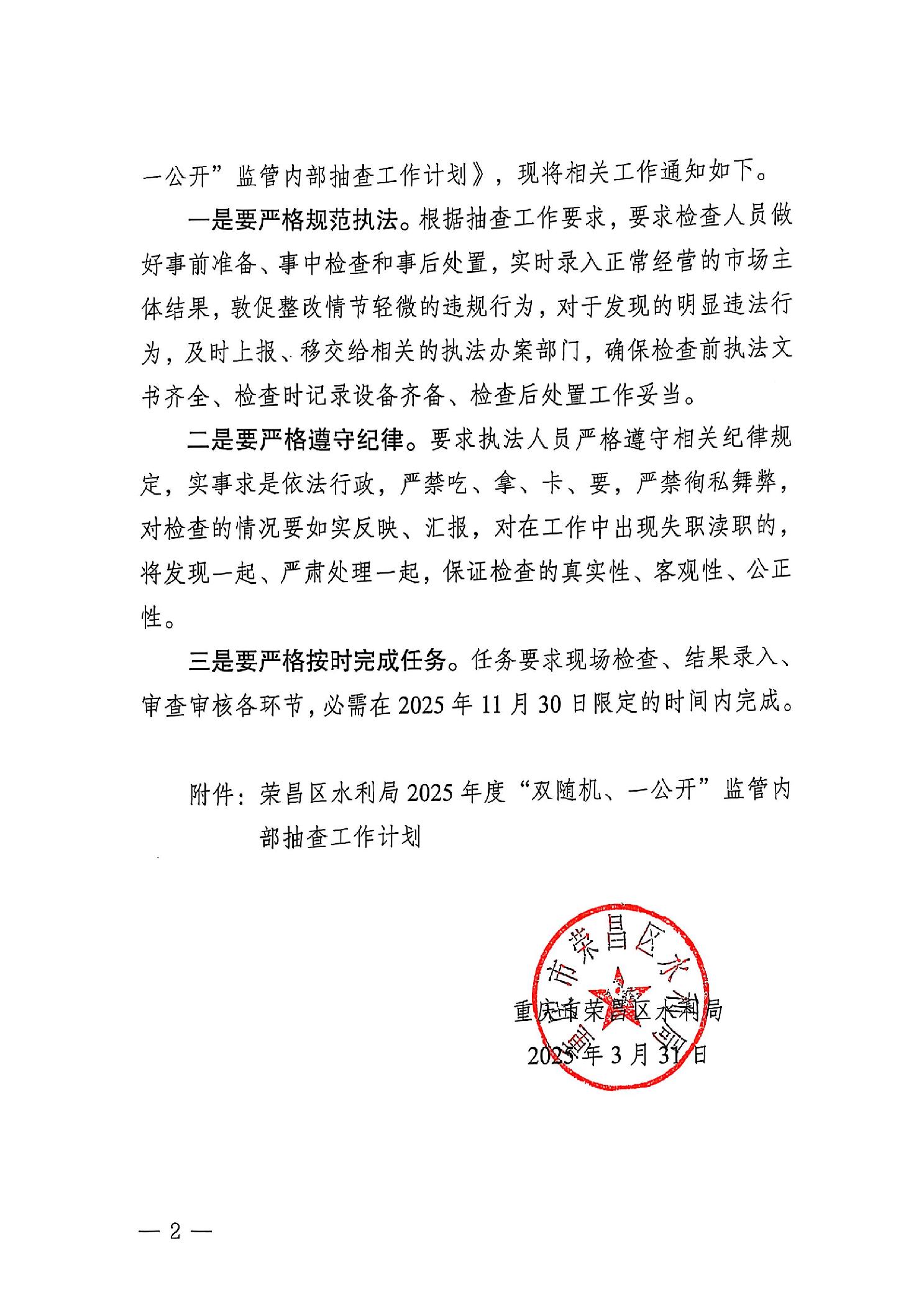 重庆市荣昌区水利局关于印发《重庆市荣昌区水利局2025年“双随机、一公开”监管内部抽查工作计划》的通知(荣水利发〔2025〕24号).pdf