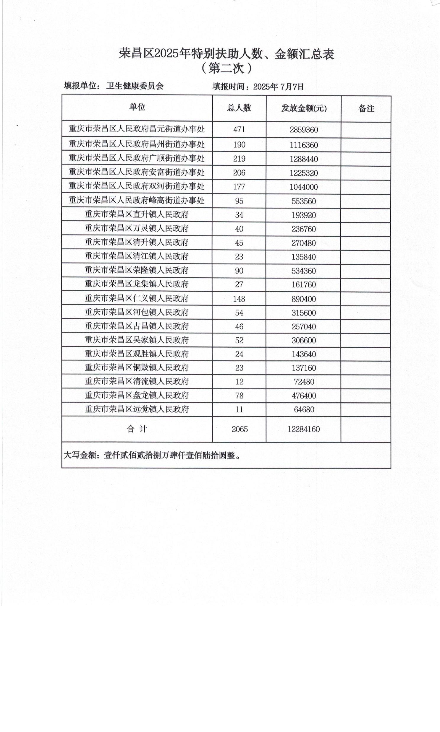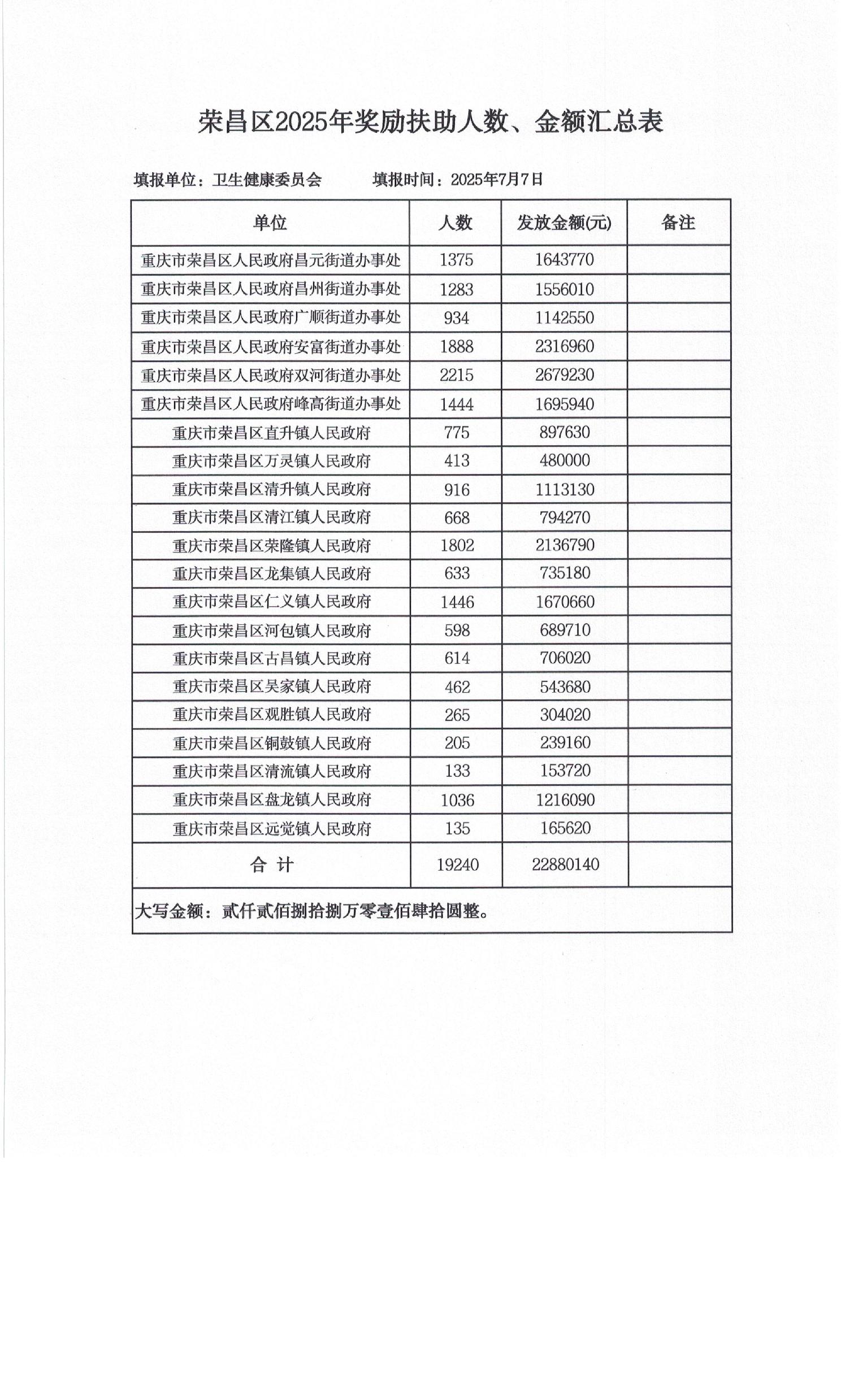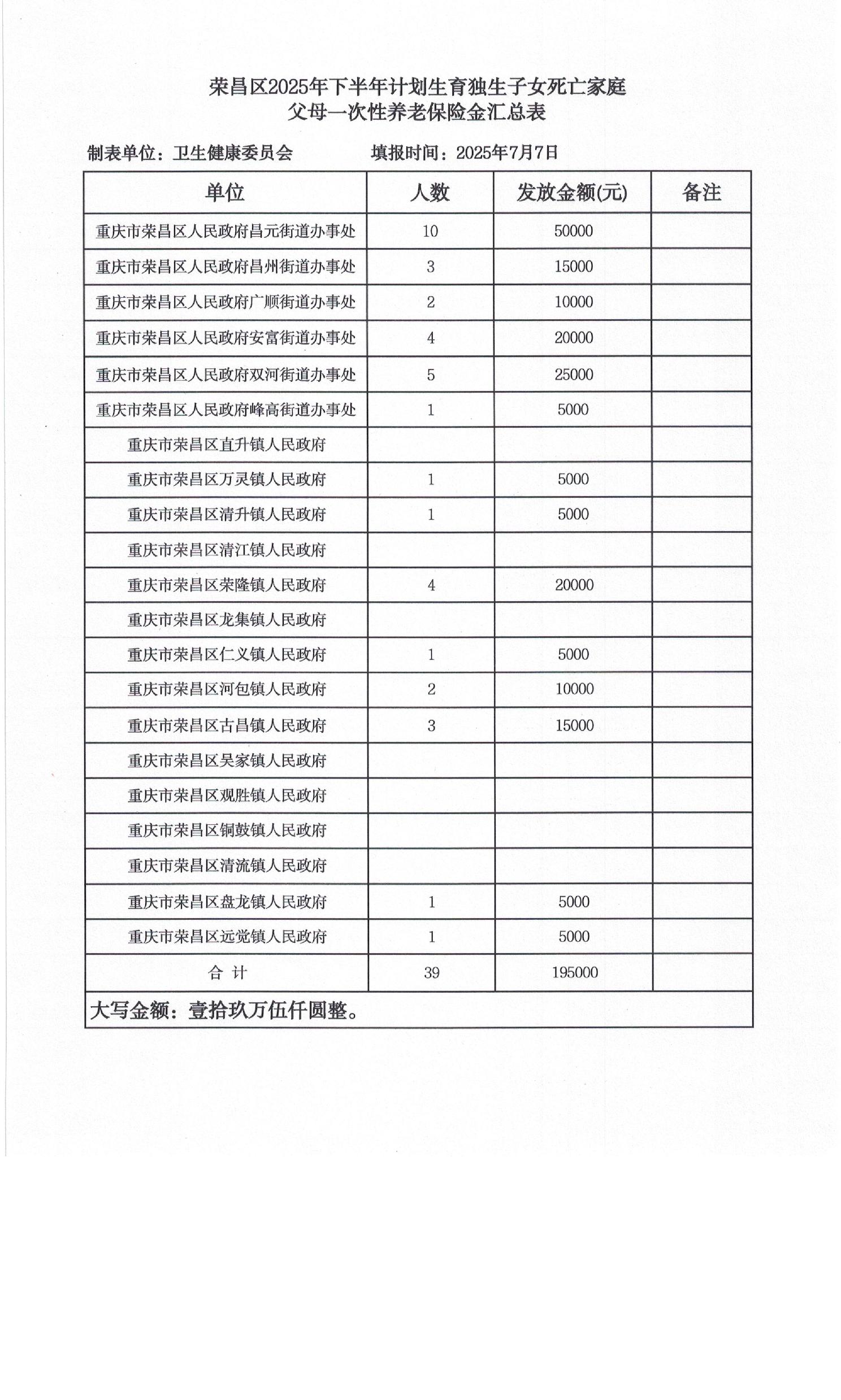 2025年7月7日发放各镇街奖、特扶、独生子女死亡家庭一次性保险资金