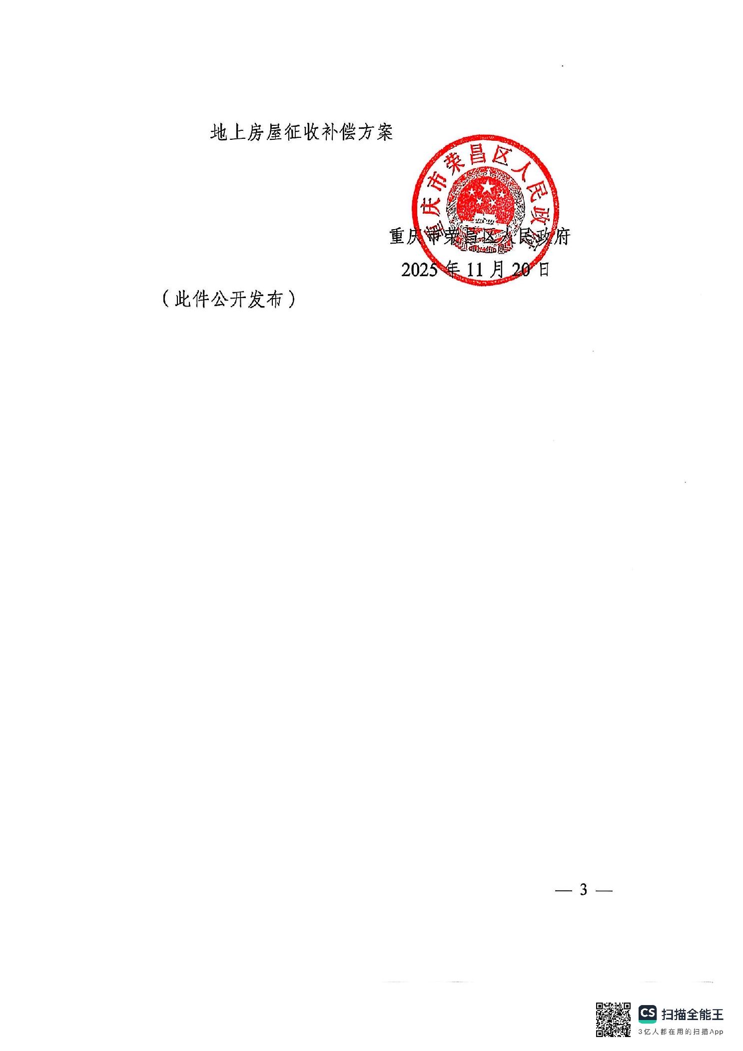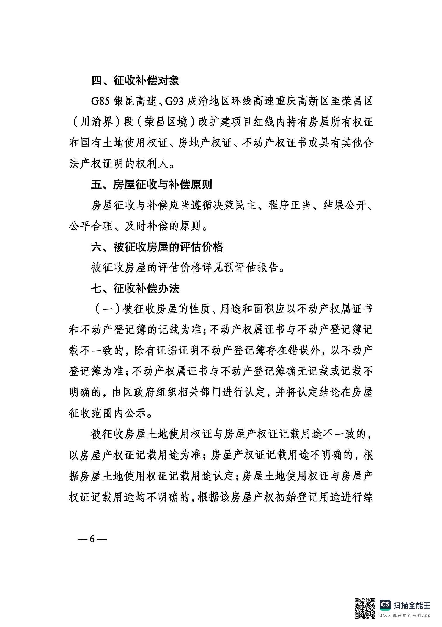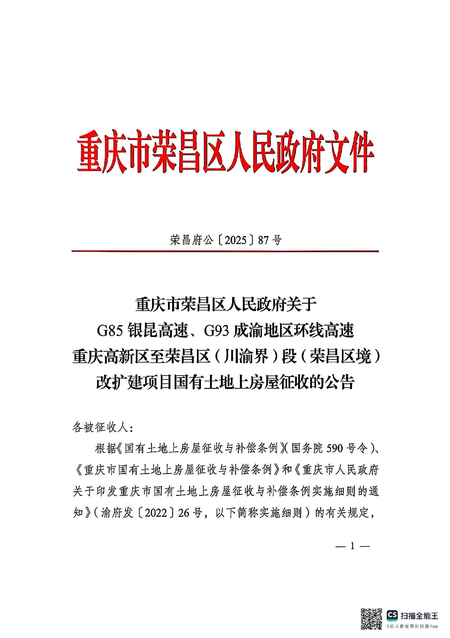 重庆市荣昌区人民政府关于G85银昆高速、G93成渝地区环线高速重庆高新区至荣昌区(川渝界)段(荣昌区境)改扩建项目国有土地上房屋征收的公告