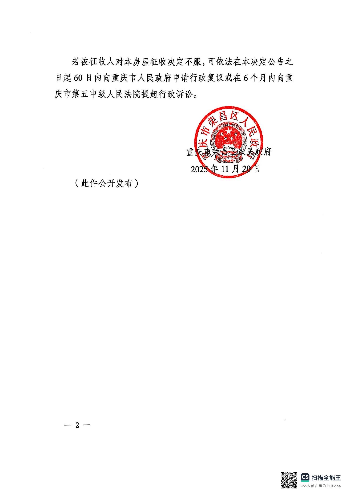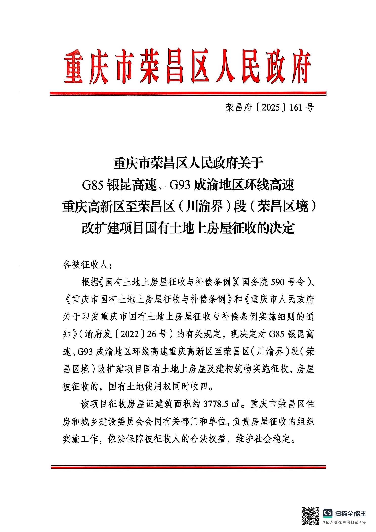 重庆市荣昌区人民政府关于G85银昆高速、G93成渝地区环线高速重庆高新区至荣昌区(川渝界)段(荣昌区境)改扩建项目国有土地上房屋征收的决定