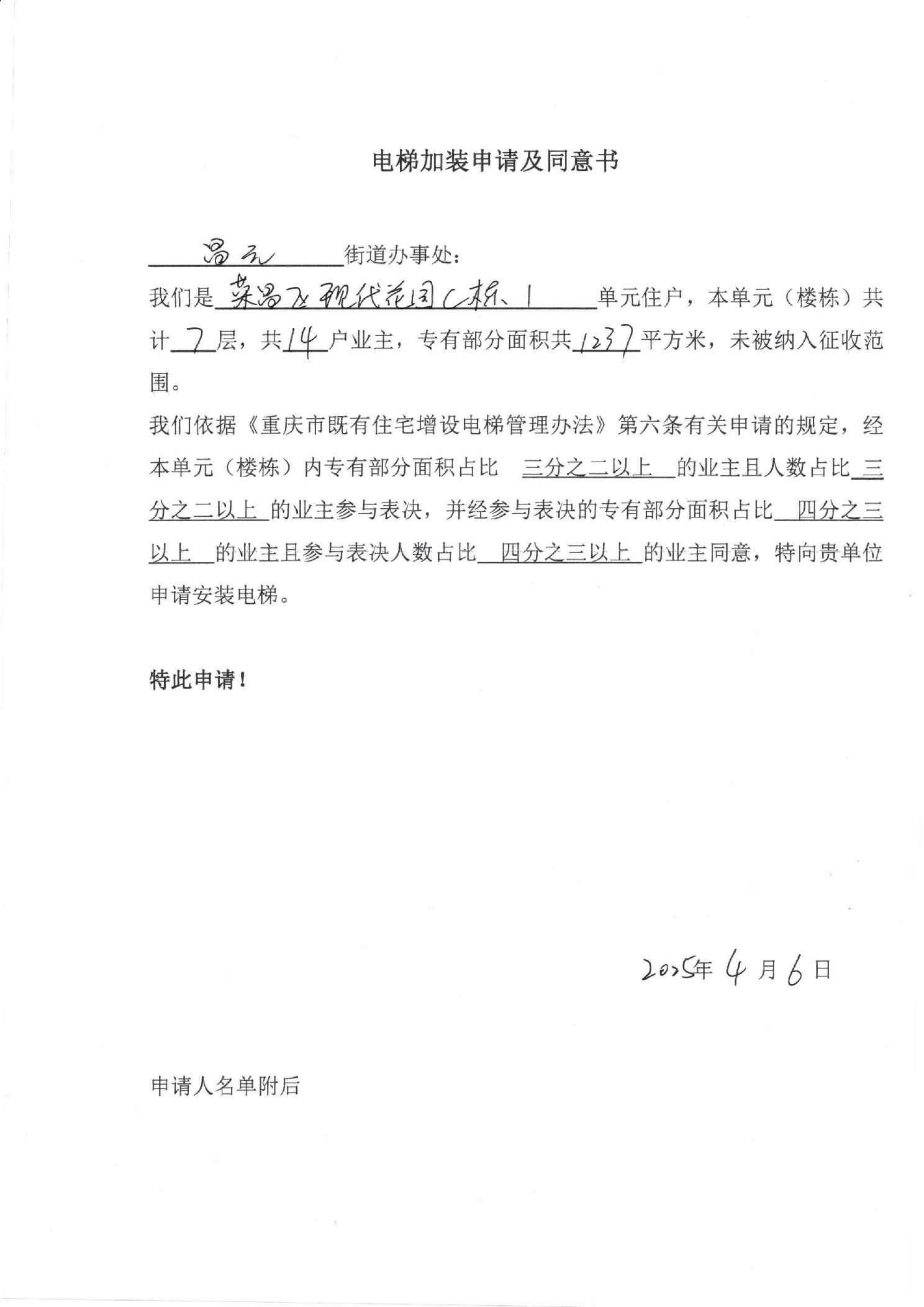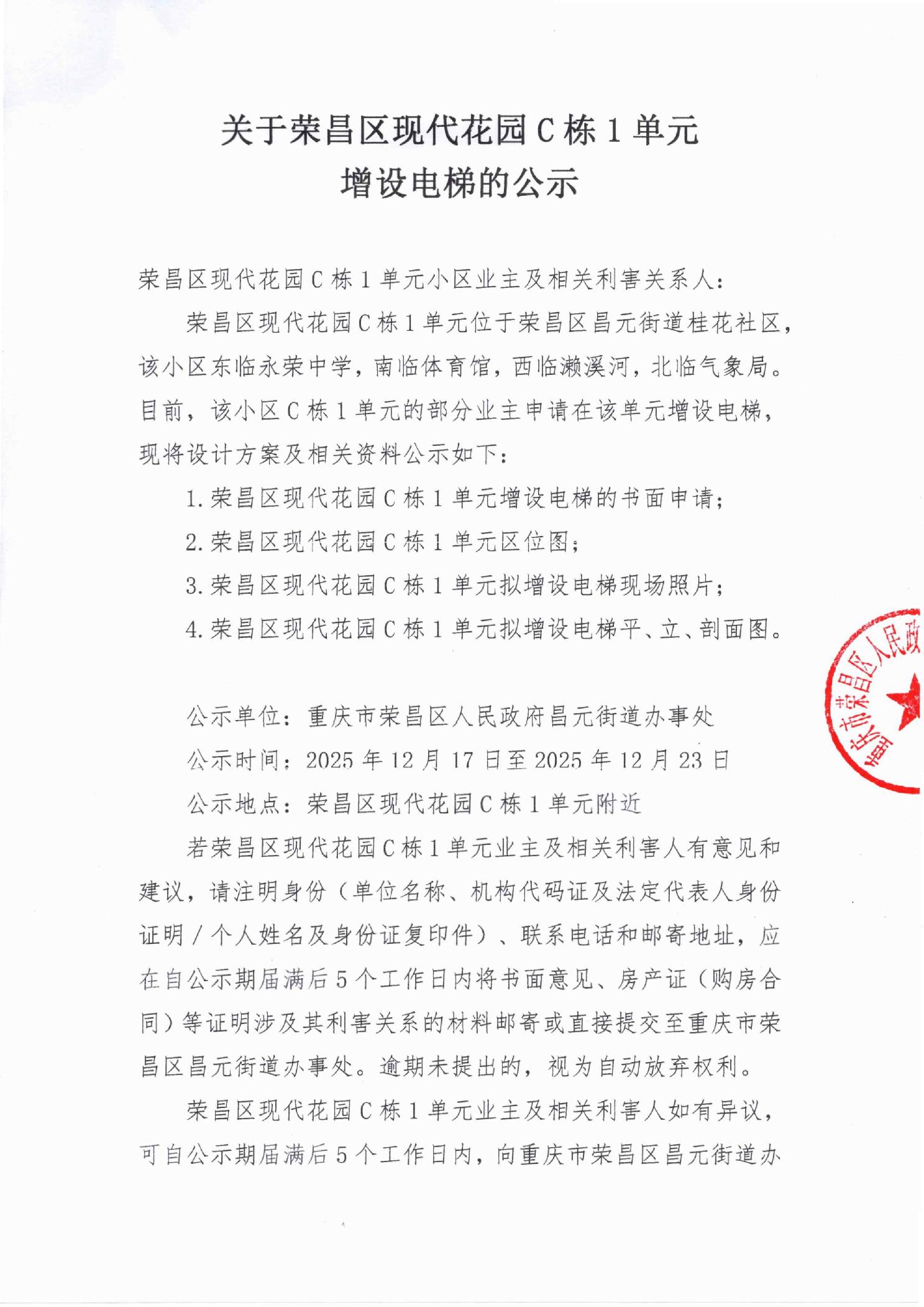 关于荣昌区现代花园C栋1单元增设电梯的公示