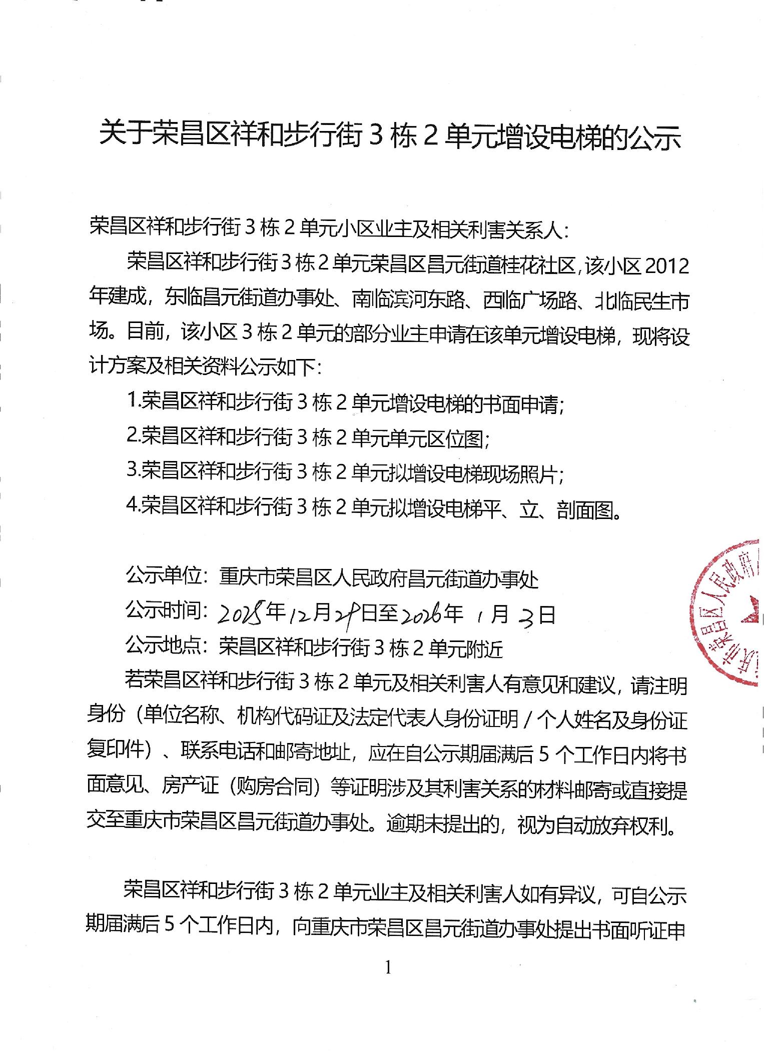 关于荣昌区祥和步行街3栋2单元增设电梯的公示