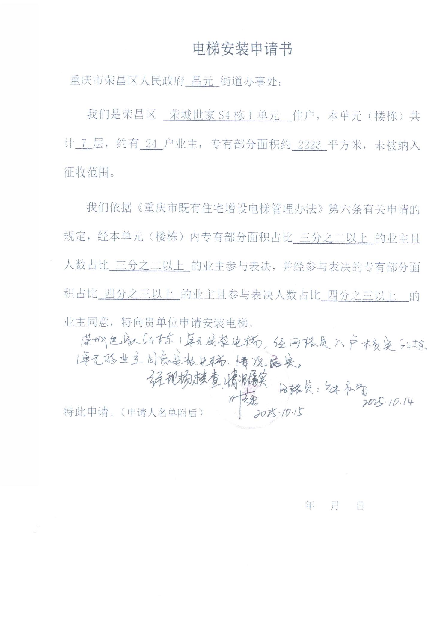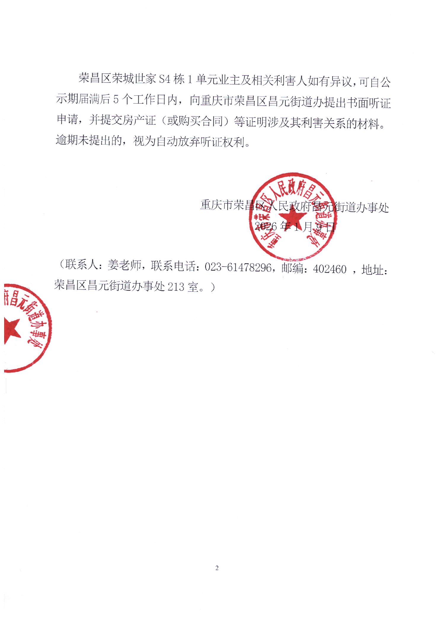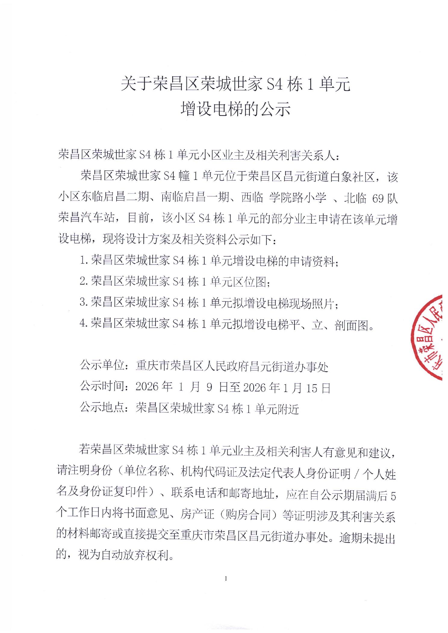 关于荣昌区荣城世家S4栋1单元增设电梯的公示