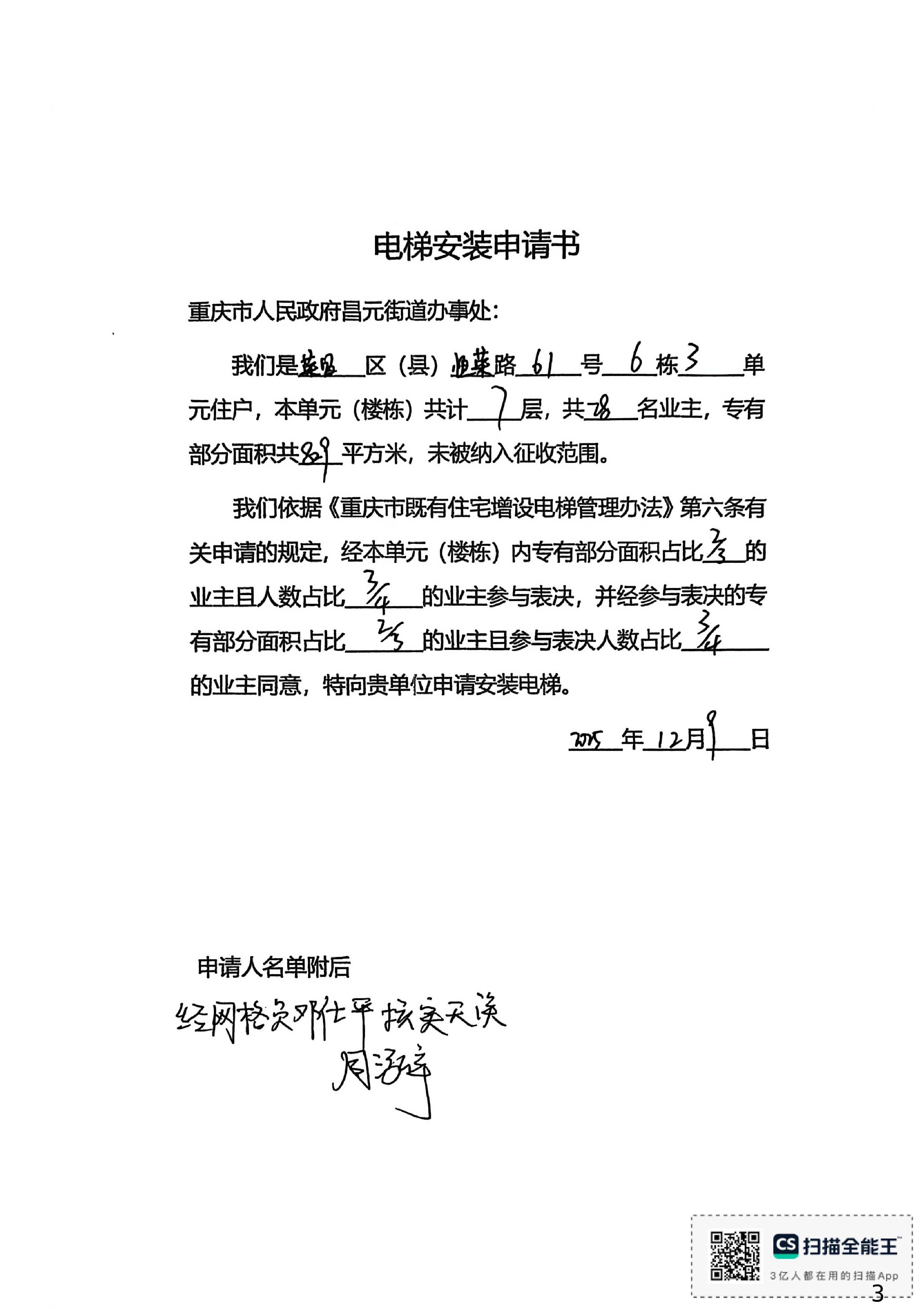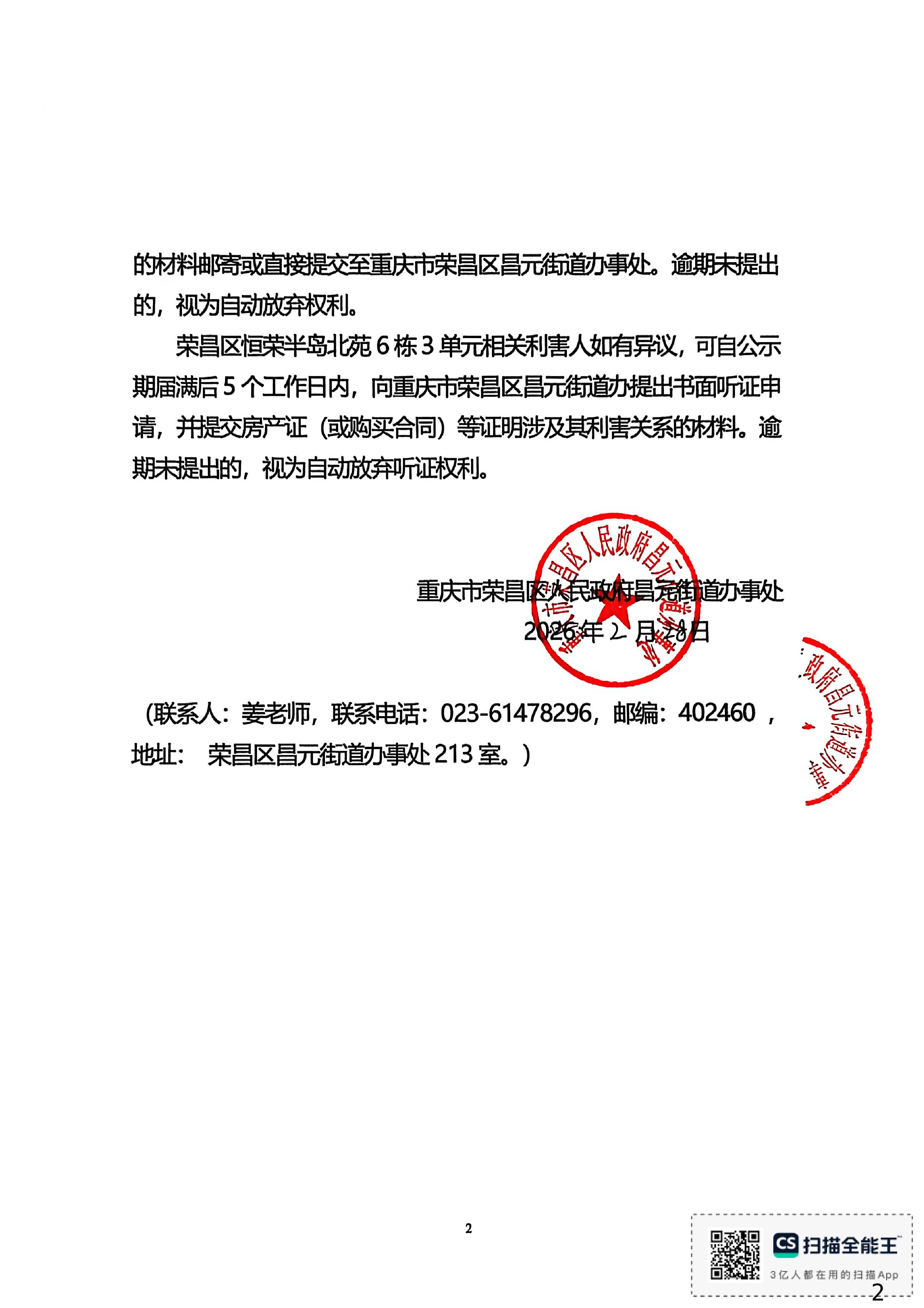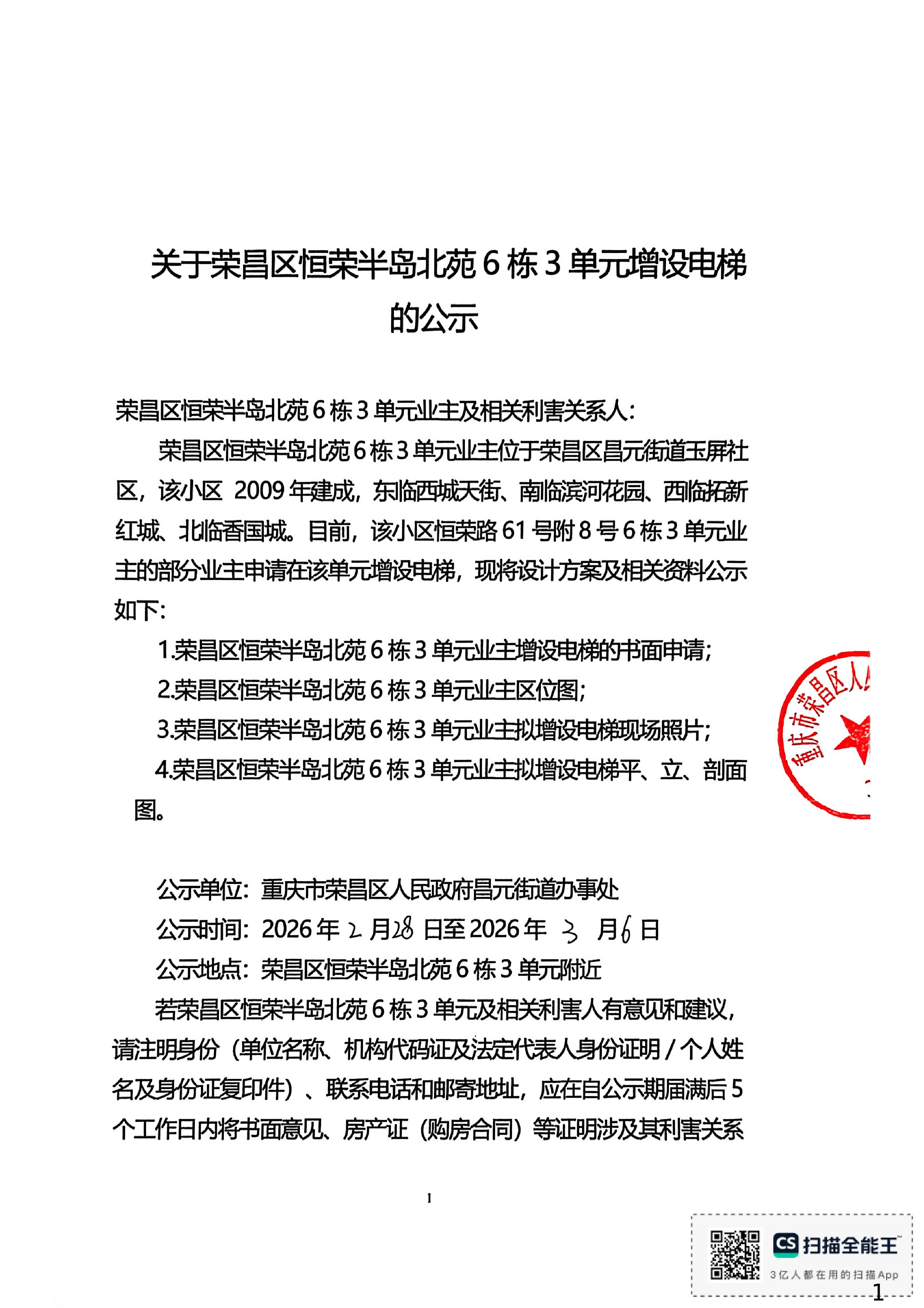 关于荣昌区恒荣半岛北苑6幢3单元增设电梯的公示