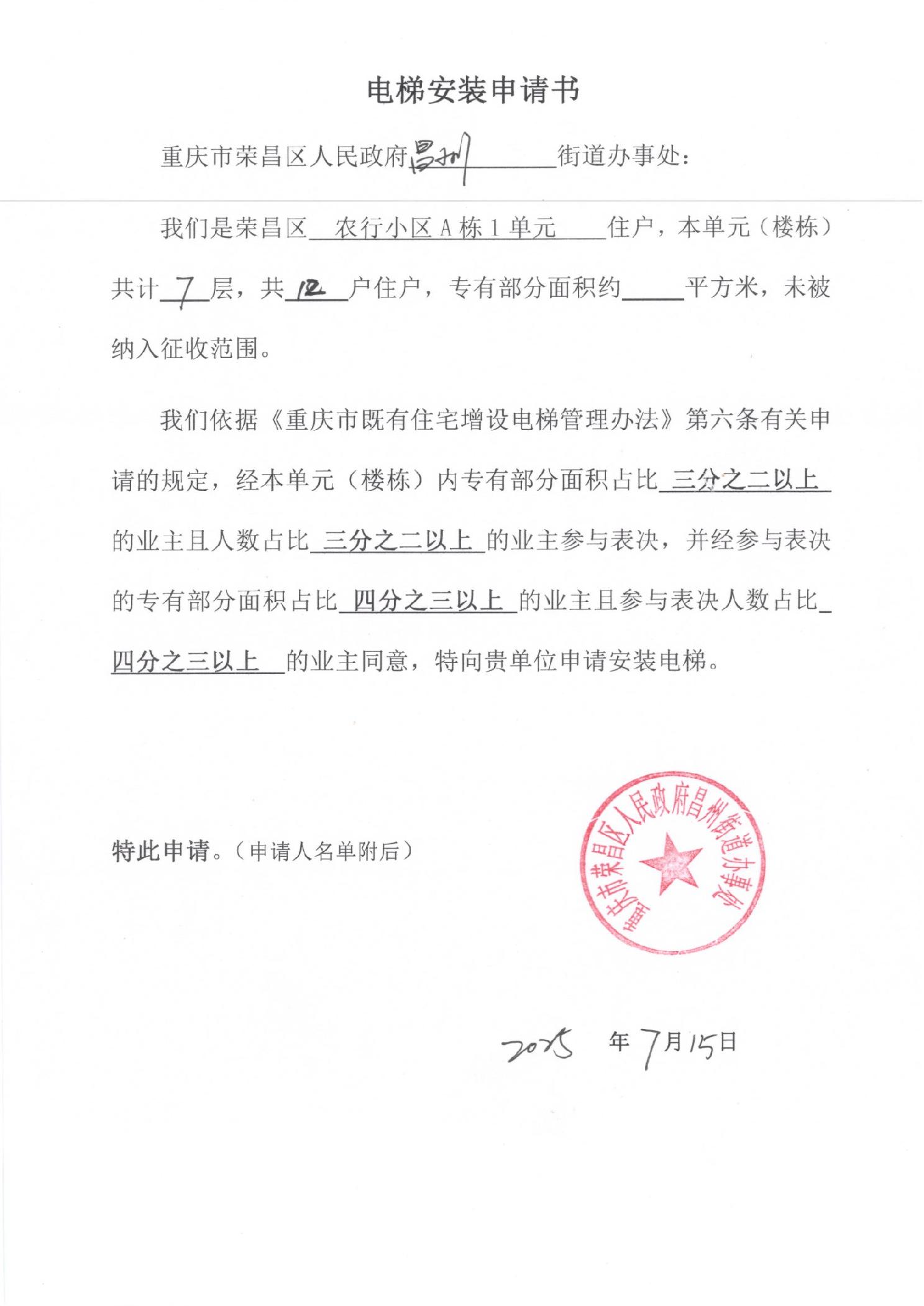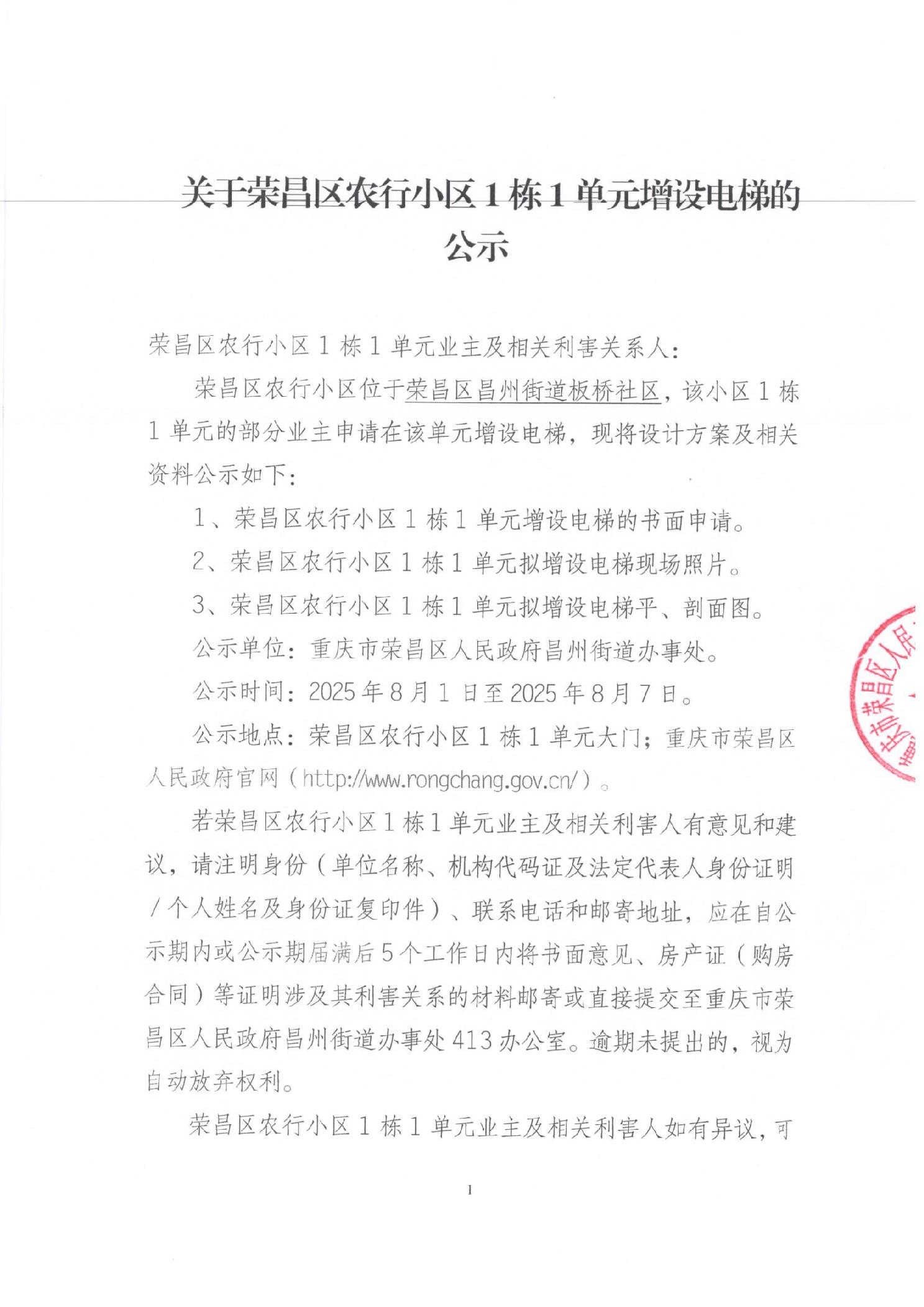 关于荣昌区农行小区1栋1单元增设电梯的公示