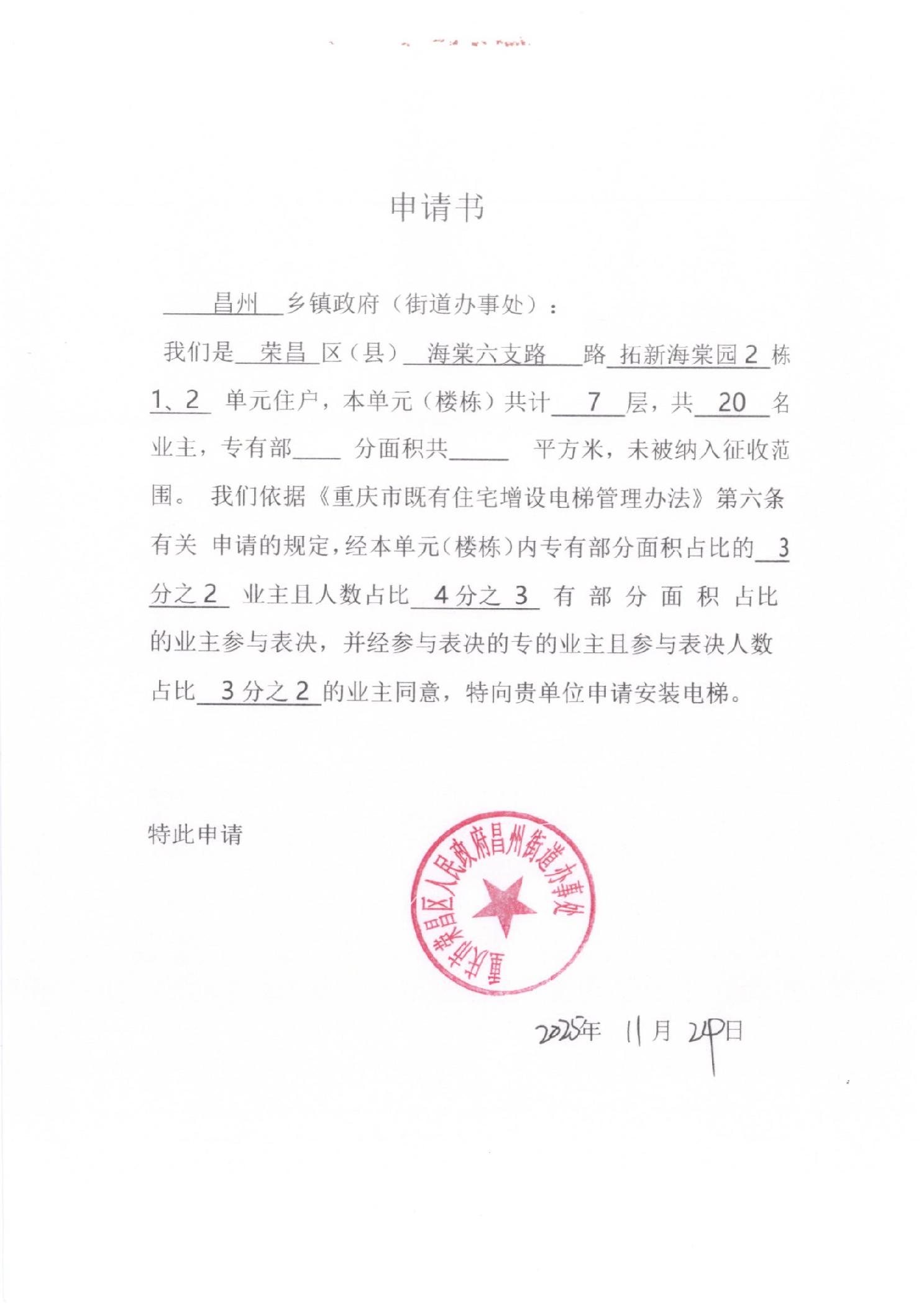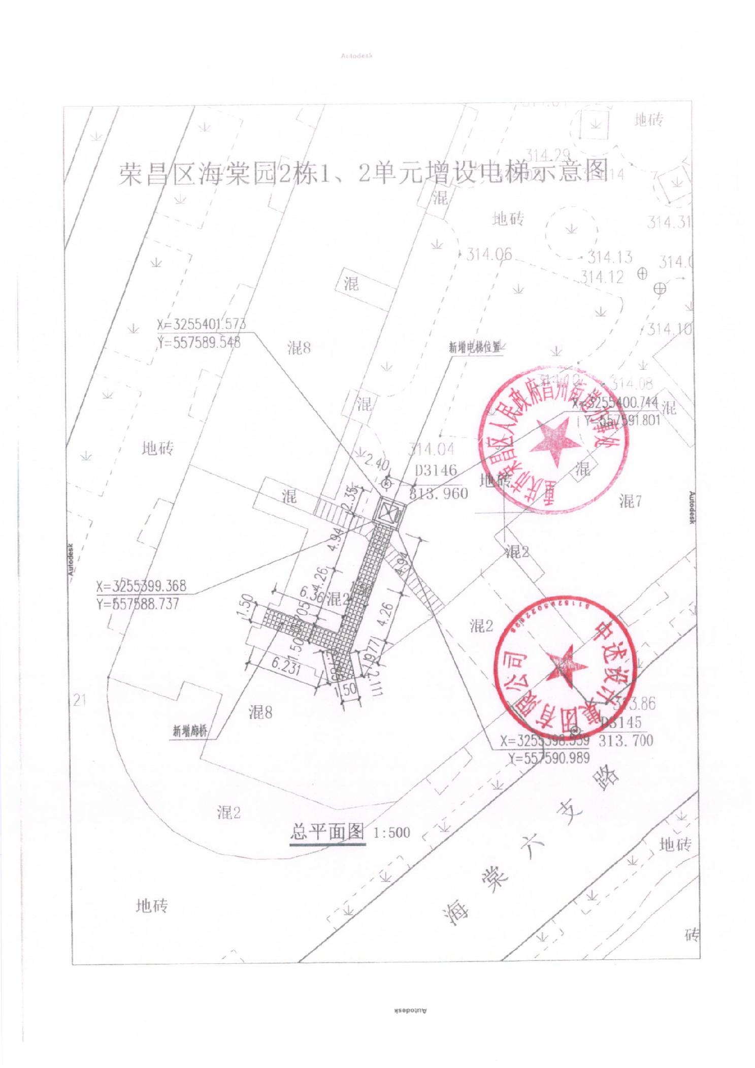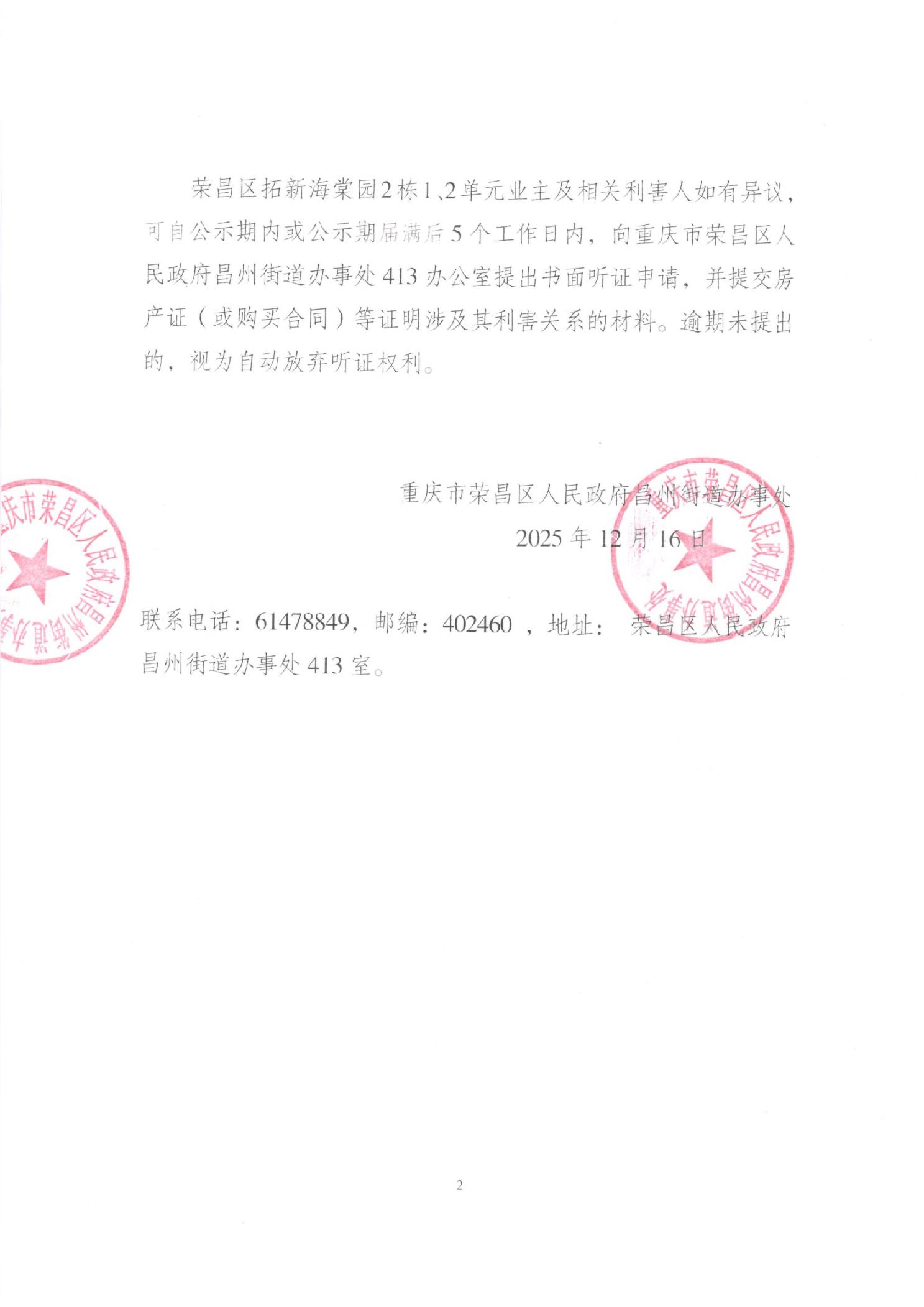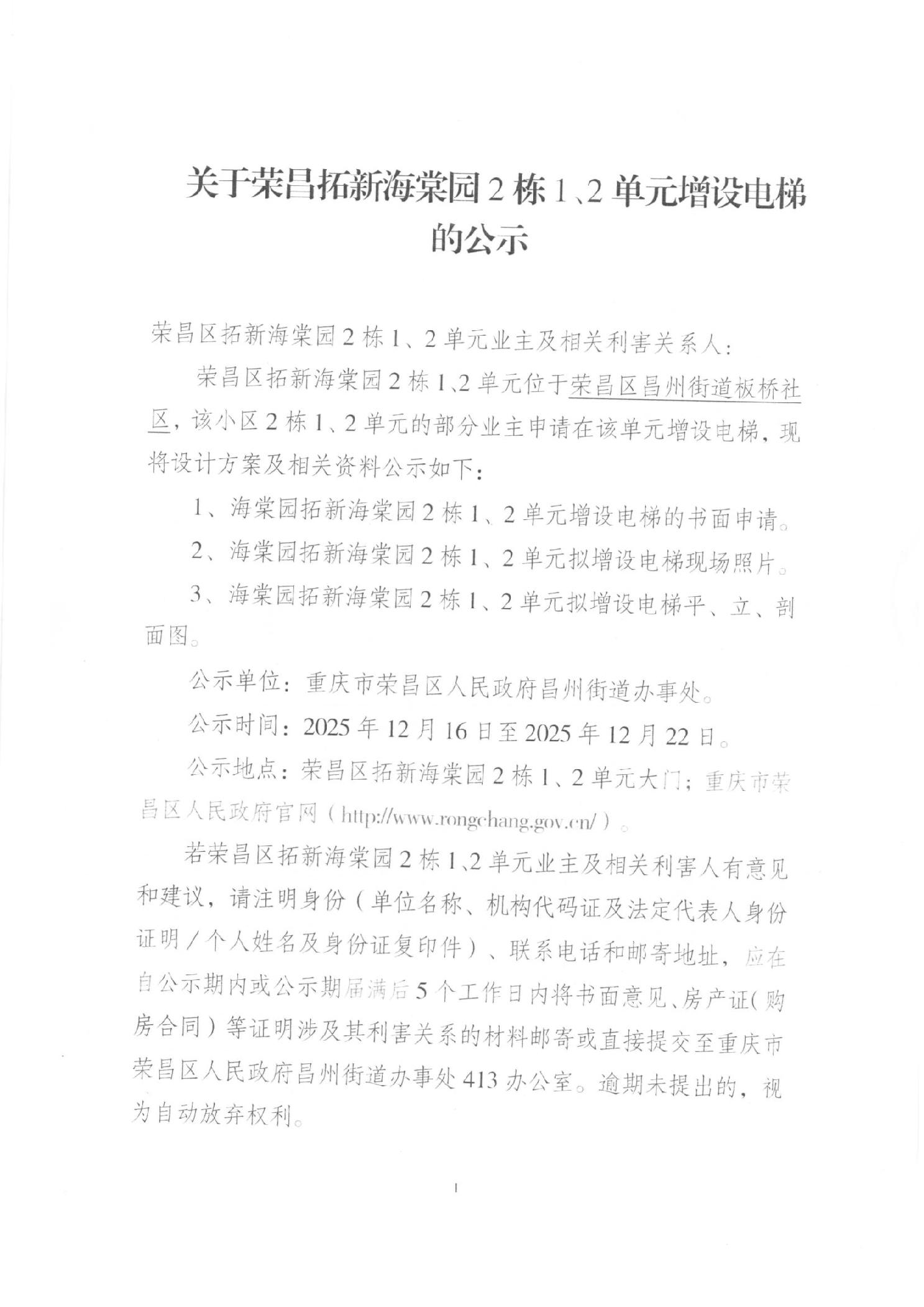 荣昌区昌州街道拓新海棠园2栋1、2单元增设电梯公示