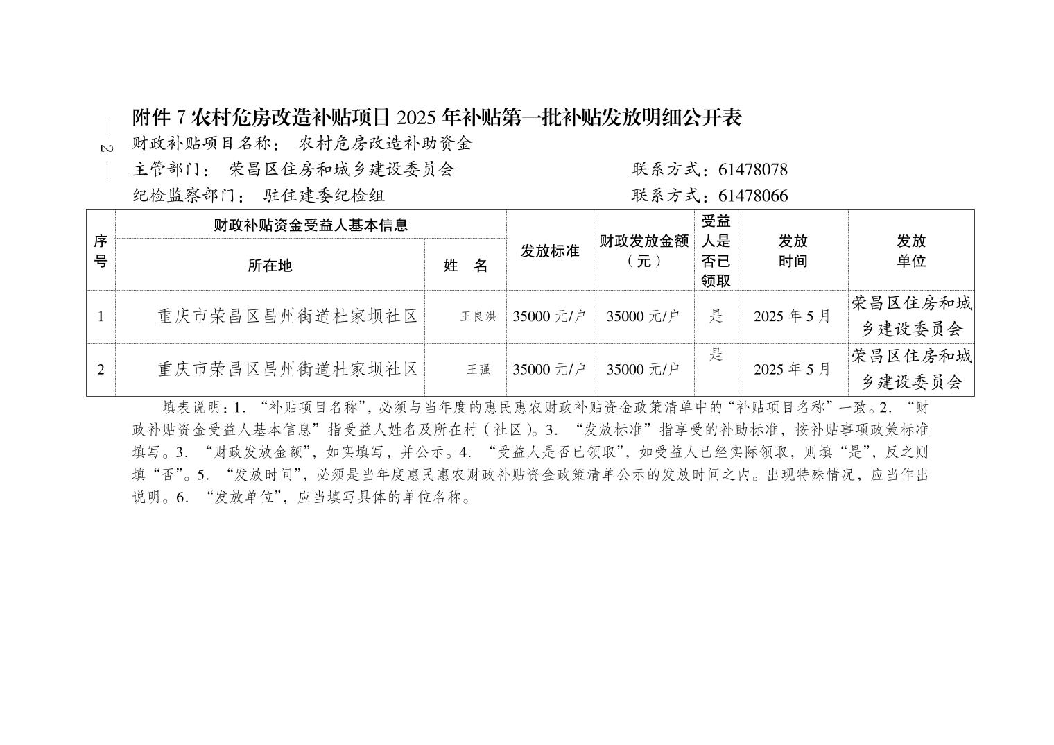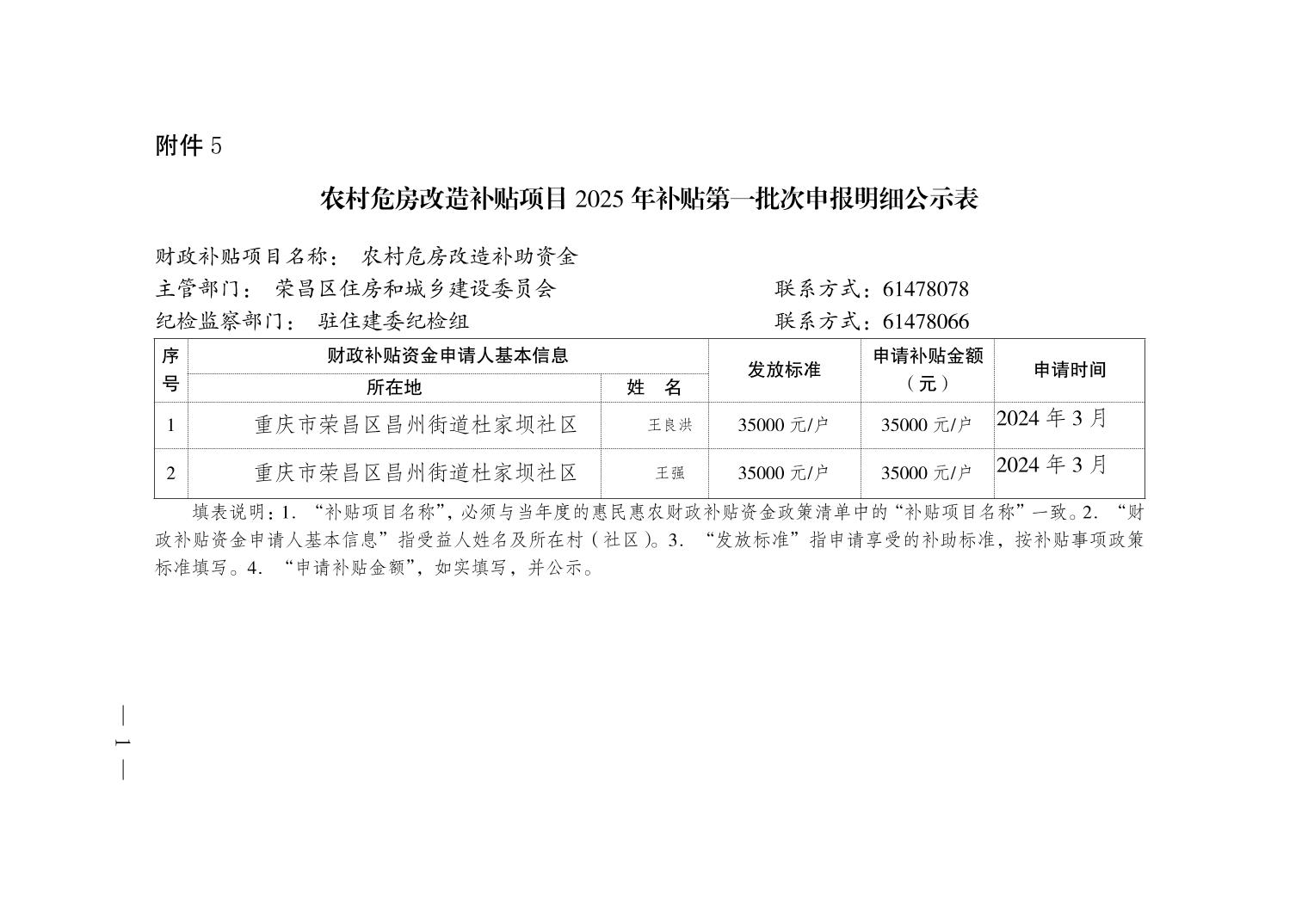 荣昌区昌州街道农村危房改造补贴项目2025年补贴第一批次申报明细公示表