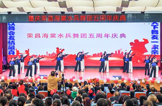 日前,荣昌水兵舞蹈团五周年庆典展演在棠城小学举办。来自川渝部分区县的30支舞蹈队齐聚于此,带来80个风格各异的舞蹈节目。现场既有步伐整齐、气势昂扬的水兵舞集体表演,也有灵动飘逸的单人、双人舞蹈,凸显舞者的个人风采,还有伦巴、三步踩、恰恰舞等经典舞种,精湛的演绎引得台下观众频频鼓掌叫好。 融媒体中心记者 何文杰 摄