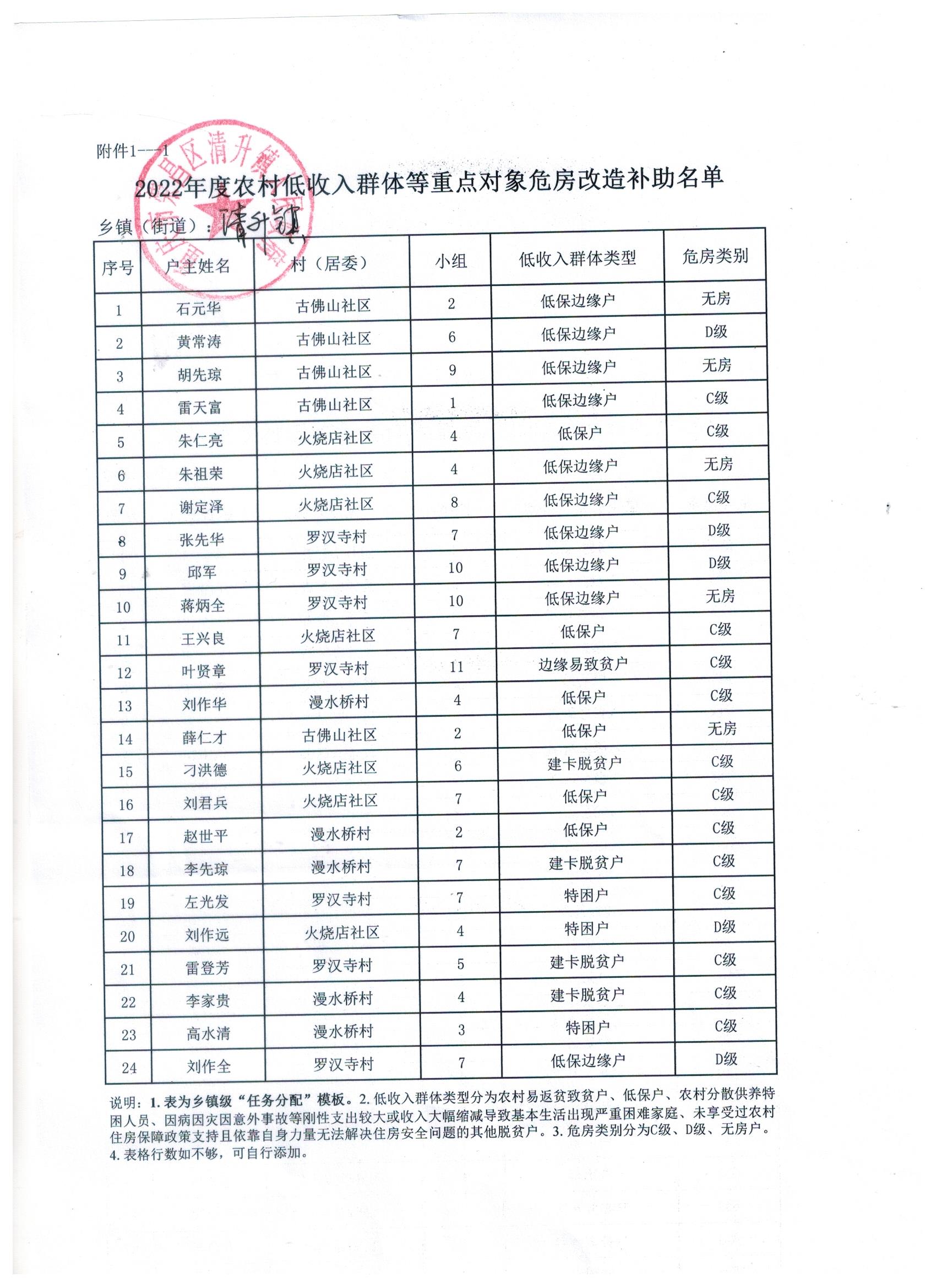 荣昌区清升镇2022年度农村低收入群体等重点对象危房改造补助名单