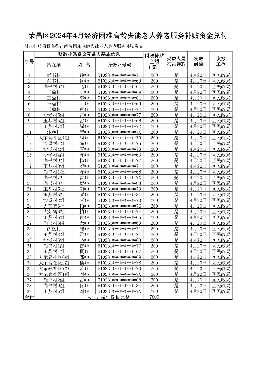 (经济困难的高龄失能老人)2024年4月荣昌区经济困难的高龄失能老人养老服务补贴对象情况公示表