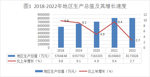 全年实现地区生产总值8173028万元,比上年增长2.7%。按产业分,第一产业增加值662142万元,增长0.6%;第二产业增加值4367550万元,增长0.9%;第三产业增加值3143336万元,增长5.7%。第一产业增加值占地区生产总值的比重为8.1%,比上年下降0.3个百分点;第二产业增加值比重为53.4%,比上年下降0.6个百分点;第三产业增加值比重为38.5%,比上年增长0.9个百分点。