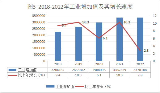 全年实现工业增加值3370188万元,比上年增长2.8%;规模以上工业增加值增长3.7%;规模以上工业企业实现总产值11293470万元,同比增长7.4%。