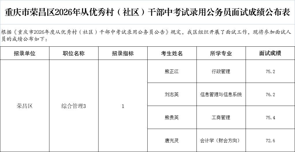 重庆市荣昌区2026年从优秀村(社区)干部中考试录用公务员面试成绩公布表