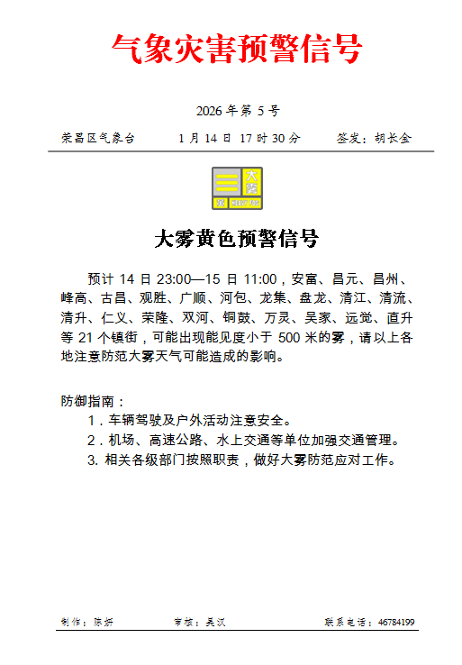 荣昌区气象台2026年1月14日17时30分发布“大雾黄色预警信号”,预计14日23:00—15日11:00,安富、昌元、昌州、峰高、古昌、观胜、广顺、河包、龙集、盘龙、清江、清流、清升、仁义、荣隆、双河、铜鼓、万灵、吴家、远觉、直升等21个镇街,可能出现能见度小于500米的雾,请以上各地注意防范大雾天气可能造成的影响。