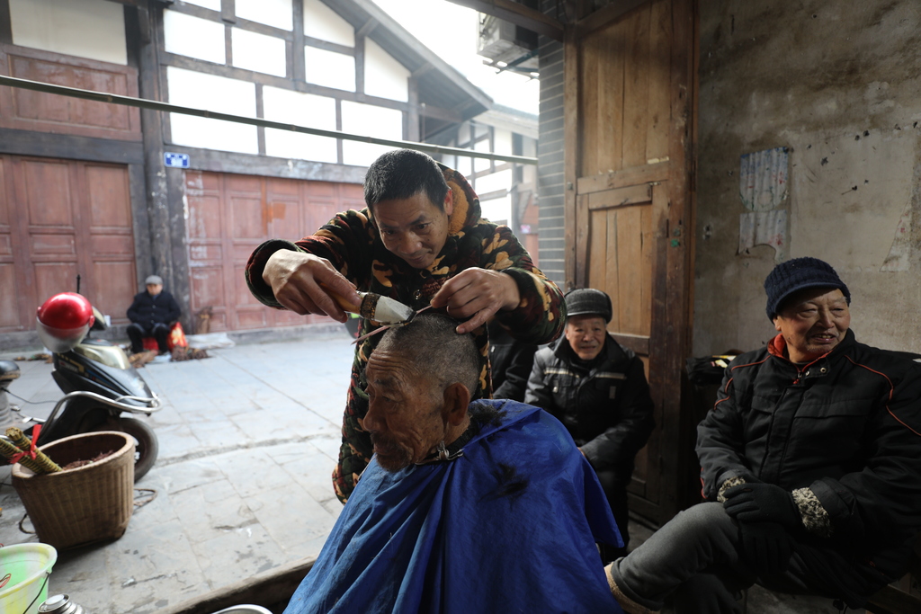 1月5日,仁义场赶集日。清晨六点半,仁义书院旁的巷子里,赶集的人流渐次汇聚。巷子尾部,一间无招牌的小理发店内,62岁店主刘隆柏正仔细擦拭着推子,村民王清和熟门熟路地走进来:“刘老板,今天还按老样子来!”拉过长板凳坐下,还不忘叮嘱:“天凉,门敞着别吹感冒了。”刘隆柏手上的活没停,笑着回应:“剪头发手脚不停,自然暖和。”话语间,尽是乡邻间的熟稔温情。