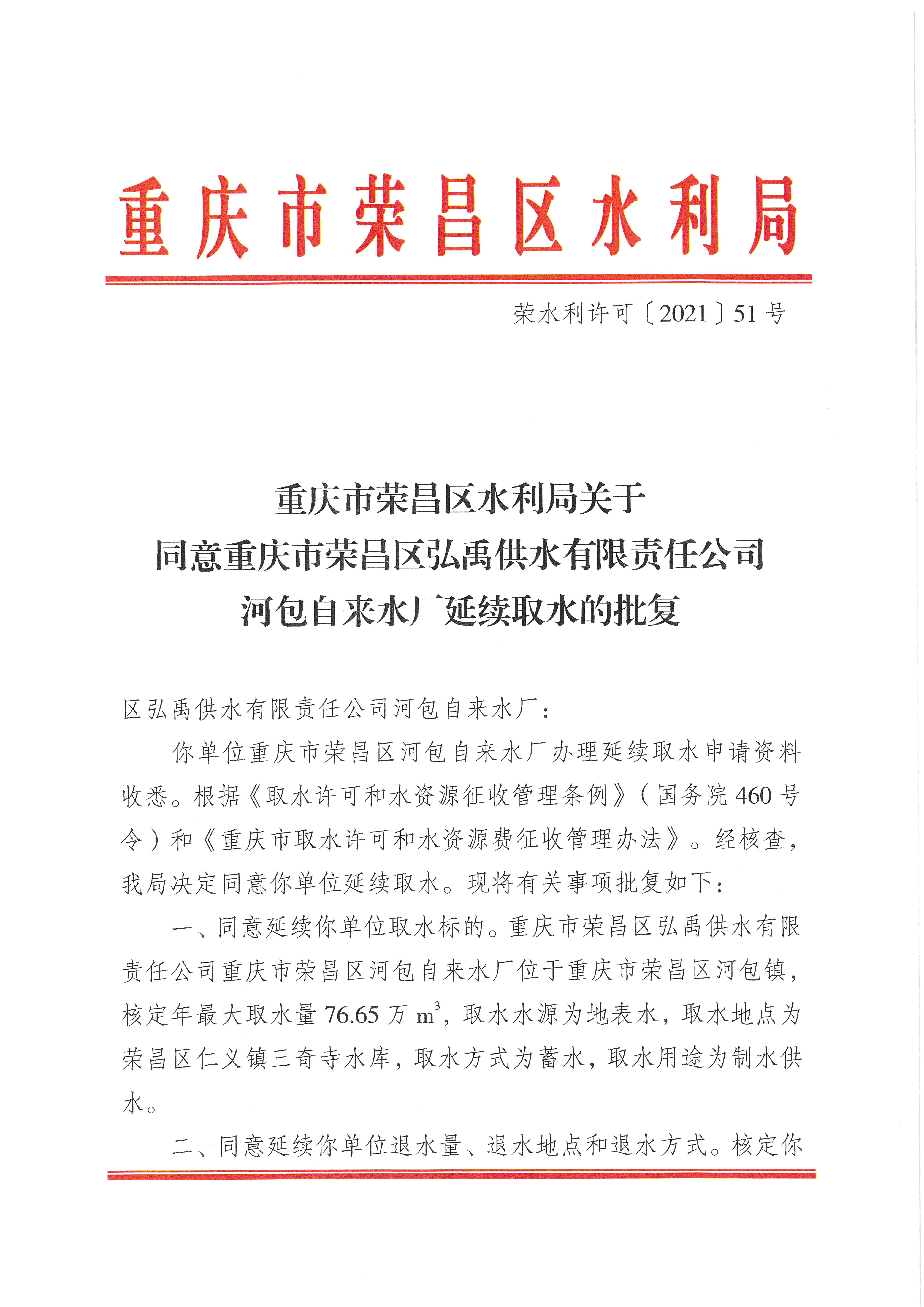重庆市荣昌区水利局关于同意重庆市荣昌区弘禹供水有限责任公司河包自来水厂延续取水的批复(荣水利许可〔2021〕51号)