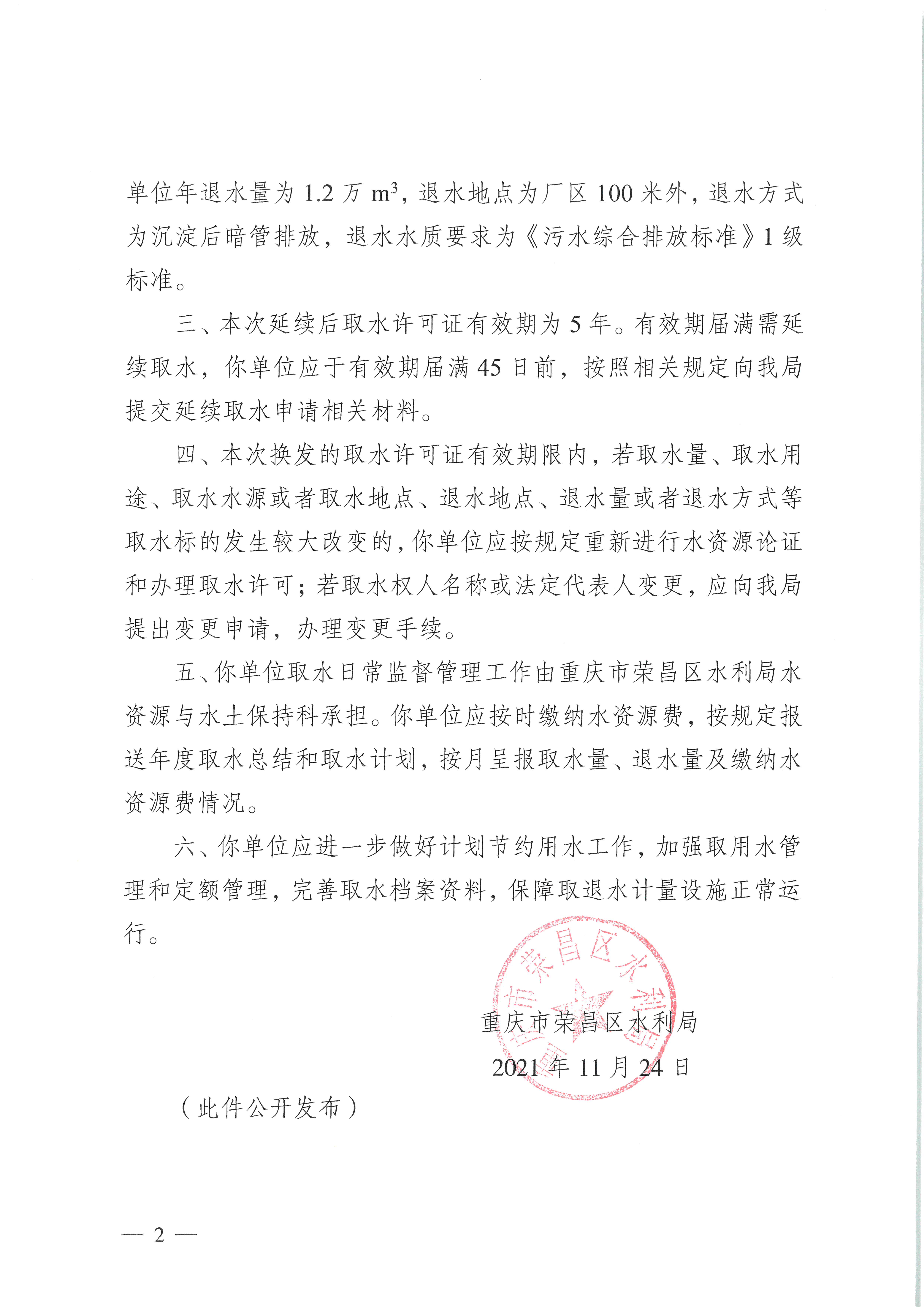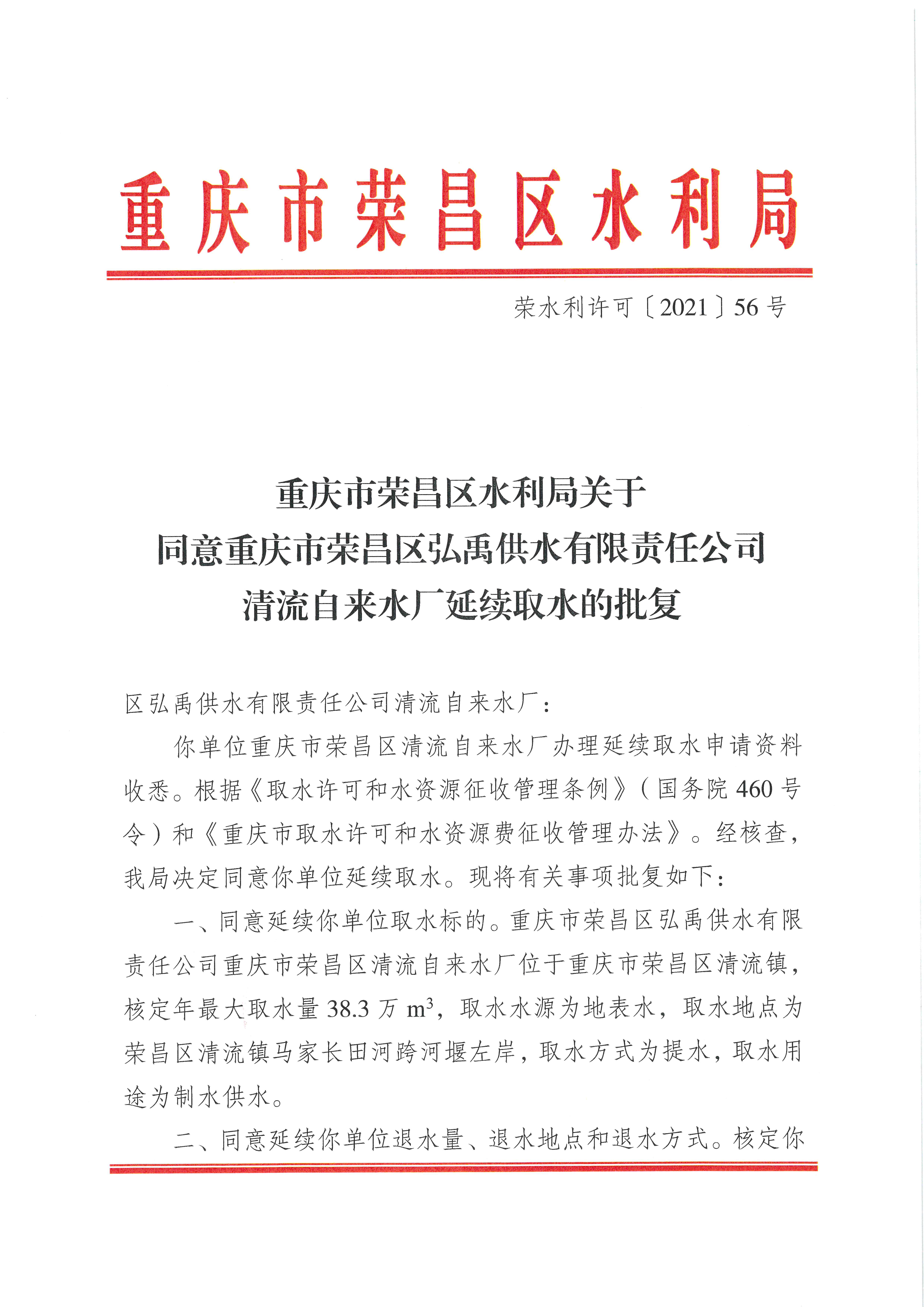 重庆市荣昌区水利局关于同意重庆市荣昌区弘禹供水有限责任公司清流自来水厂延续取水的批复(荣水利许可〔2021〕56号)