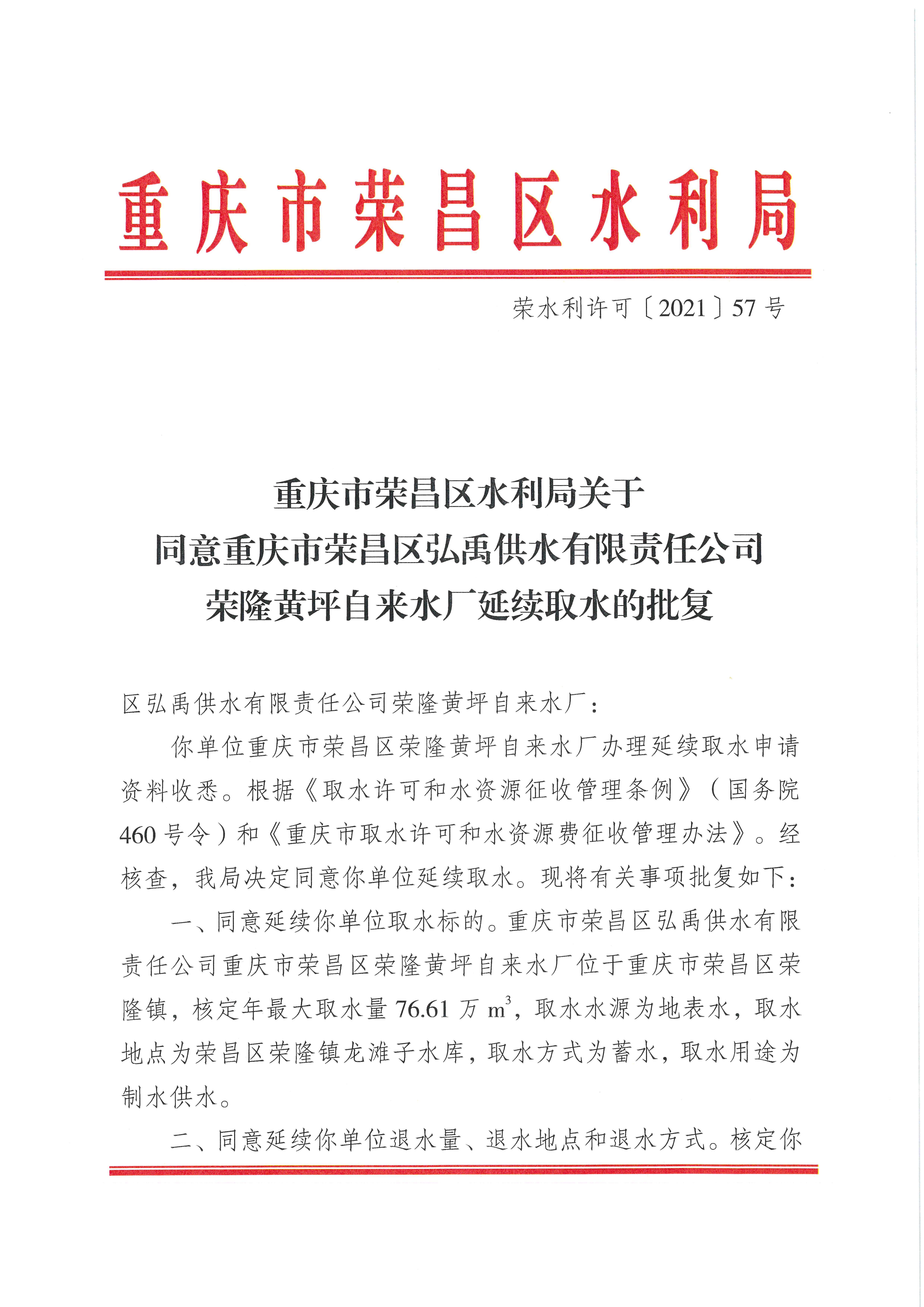 重庆市荣昌区水利局关于同意重庆市荣昌区弘禹供水有限责任公司荣隆黄坪自来水厂延续取水的批复(荣水利许可〔2021〕57号)