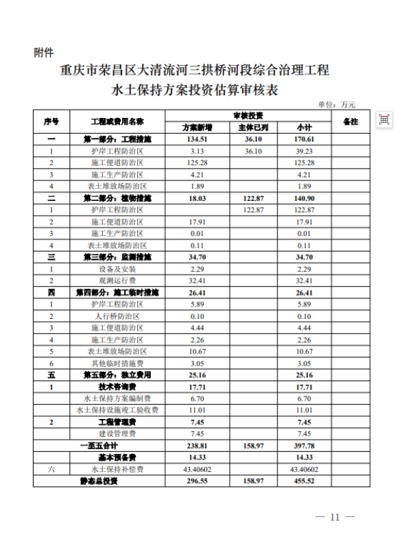 工程水土保持总投资为455.52万元,其中主体已有水土保持投资158.97万元,方案新增水土保持投资296.55万元。