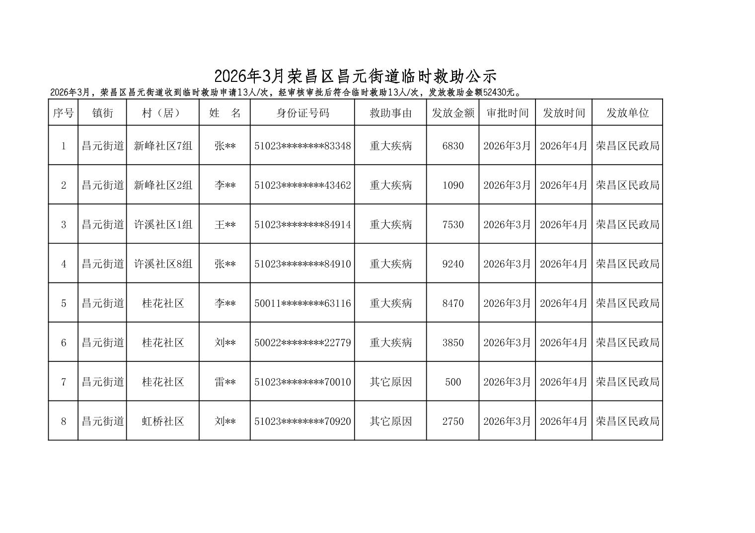 2026年3月荣昌区昌元街道临时救助公示