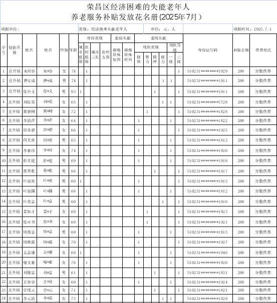 荣昌区2025年7月经济困难的失能老年人养老服务补贴