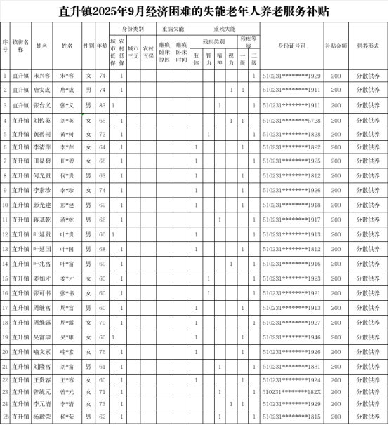 直升镇2025年9月经济困难的失能老年人养老服务补贴